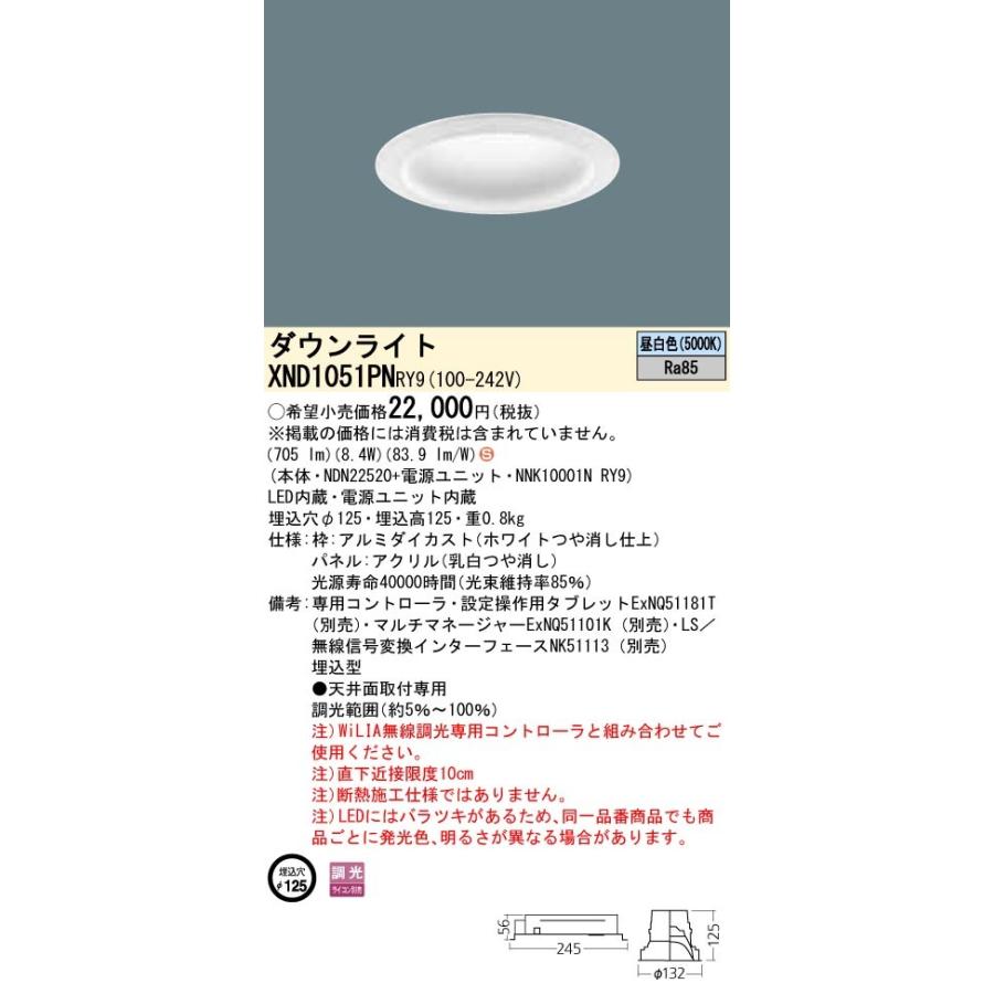 【法人様限定】パナソニック XND1051PNRY9 LEDダウンライト 埋込穴φ125 昼白色 調光【NDN22520 + NNK10001N RY9】