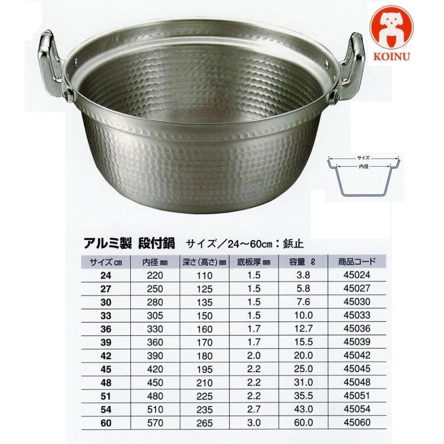仔犬印業務用アルミ製段付鍋45cm(容量約25.0L)鋲止日本製