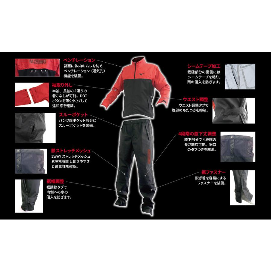 ミズノ ゴルフ レインウェア メンズ上下セット ムーブ レインスーツ0A01 はっ水 防水動きやすい!耐水圧20000mmの高機能レインスーツ。カラー05:グレー09:ブラック96:ブラック×レッド表地:ポリエステル100%裏地:ポリエステル100%・耐水圧20000mm 透湿20000mm・ムレを防ぐベンチレーション・袖取り外し可能・ウエスト調整機能・股下調整機能・貫通ポケット・一部裏地メッシュ仕様袖先、膝下はメッシュ仕様ではありません。・動きやすいウエア設計を採用したミズノムーブテック52MG0A0105 52MG0A0109 52MG0A0196男性 ゴルフ ウエア 長袖 長ズボン 黒※沖縄を除き送料無料