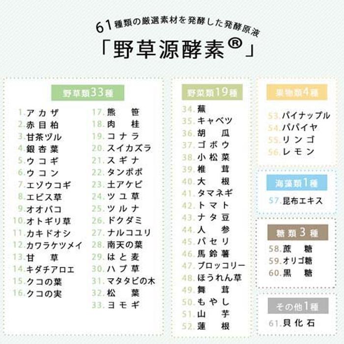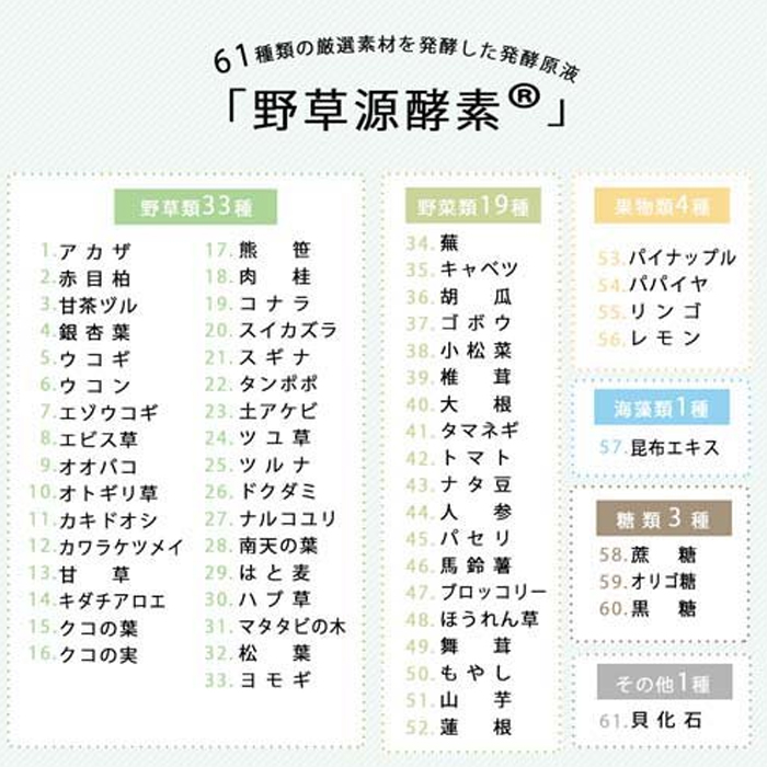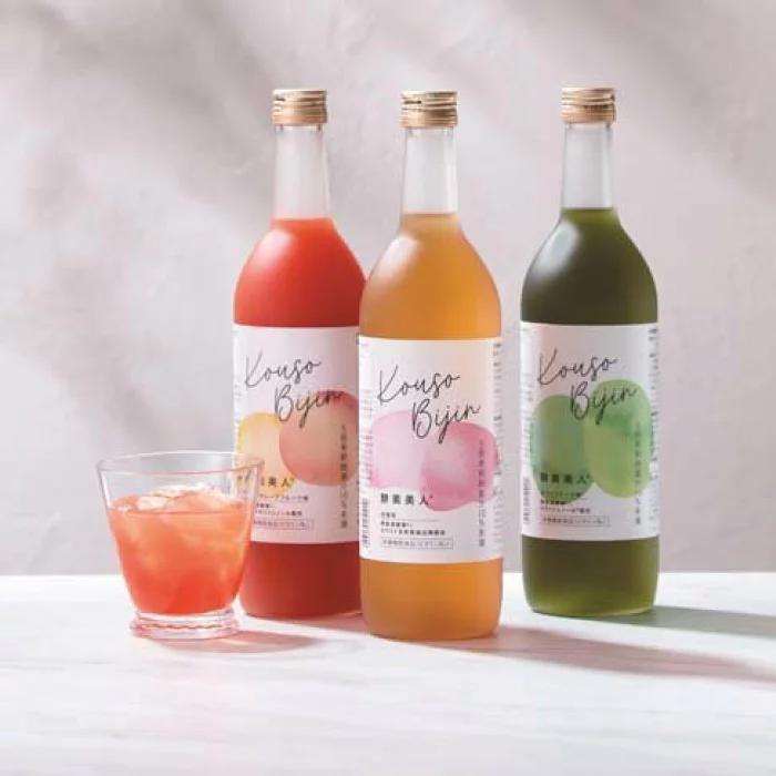 | 成分 | 【ピンクグレープフルーツ味】 果糖ぶどう糖液糖(国内製造)、グレープフルーツ果汁、りんご酢、植物発酵物(やまいもを含む)、 イソマルトオリゴ糖シラップ、はちみつ、 アセロラ濃縮果汁粉末(アセロラ濃縮果汁加工品、食物繊維)、 乳酸菌発酵液(大豆を含む)、L-カルニチン、ライチポリフェノール加工品/クエン酸、 香料、野菜色素、クエン酸Na、苦味料、ビタミンC、焼成Ca、ビタミンB6、パントテン酸カルシウム、 チャ抽出物、ビタミンB1、 ビタミンB2 【キウイ味】 果糖ぶどう糖液糖(国内製造)、キウイフルーツ果汁、りんご酢、植物発酵物(やまいもを含む)、 ガラクトオリゴ糖、はちみつ、乳酸菌発酵液(大豆を含む)、米胚芽エキス加工粉末 (ポリアミン含有米胚芽抽出物、澱粉分解物)、キウイエキス末(キウイエキス粉末、デキストリン)、 フランス海岸松樹皮エキス/クエン酸、香料、ビタミンC、クエン酸Na、クチナシ青色素、 ベニバナ黄色素、ビタミンB6、ビタミンB2 【白桃味】 砂糖(国内製造)、もも果汁、果実酢、植物発酵物(りんご・やまいもを含む)、はちみつ、 コラーゲンペプチド、乳酸菌発酵液(大豆を含む)、マグロエラスチンパウダー、 桃抽出物/クエン酸、香料、ビタミンC、ビタミンB6、ヒアルロン酸、シクロデキストリン |
