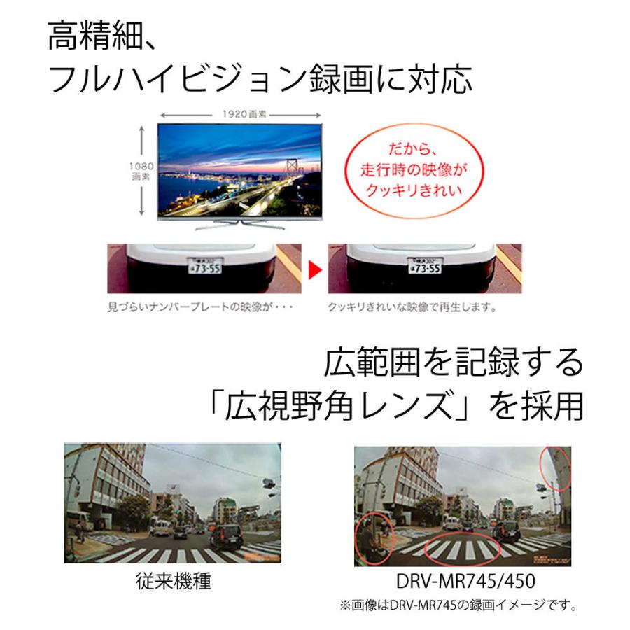 万が一の際に迷わず、すばやく押せる「緊急イチ押し録画ボタン(手動録画ボタン)」を搭載。SDカードの定期的なフォーマットが不要「SDカードメンテナンスフリー」業界トップクラスの最長24時間タイマー録画に対応。「駐車監視録画※」機能搭載。(※車載電源ケーブルCA-DR350(別売り)が必要です。)高精細、フルハイビジョン録画に対応広範囲を記録する「広視野角レンズ」を採用業界トップクラスの明るさ、「F1.8明るいレンズ」を採用HDR搭載一律4万円の補償金が支払われる交通事故時ドライブレコーダー買替補償金制度。LED信号機に対応。■ドライブレコーダーご使用上の注意事項について本製品は、あらゆる状況においての映像の記録を保証するものではありません。本製品は、事故の証拠として裁判などで効力を保証するものではありません。【注意事項】商品の詳細はご注文前にメーカーサイトもしくはカタログ等で御確認ください。検索キーワード:ドラレコ ドライブレコーダー 煽り運転対策 HDR ディスプレイ 液晶モニター 駐車監視 運転記録 コンパクト 小型 ノイズ対策 常時録画 衝撃検知 Gセンサー 車内音声録音 前後カメラ 2カメラ 常時録画 衝撃録画