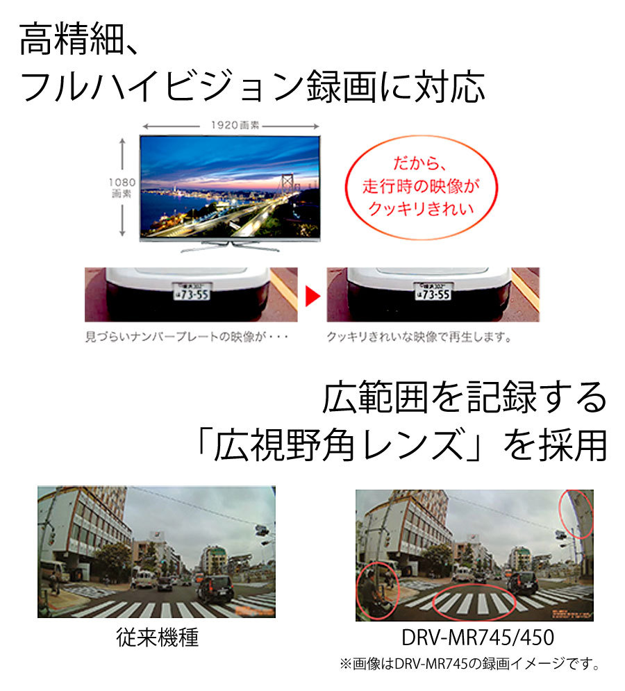 | 万が一の際に迷わず、すばやく押せる「緊急イチ押し録画ボタン(手動録画ボタン)」を搭載。 SDカードの定期的なフォーマットが不要「SDカードメンテナンスフリー」 業界トップクラスの最長24時間タイマー録画に対応。「駐車監視録画※」機能搭載。 (※車載電源ケーブルCA-DR350(別売り)が必要です。) 高精細、フルハイビジョン録画に対応 広範囲を記録する「広視野角レンズ」を採用 業界トップクラスの明るさ、「F1.8明るいレンズ」を採用 HDR搭載 一律4万円の補償金が支払われる交通事故時ドライブレコーダー買替補償金制度。 LED信号機に対応。 | ||||||||