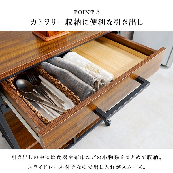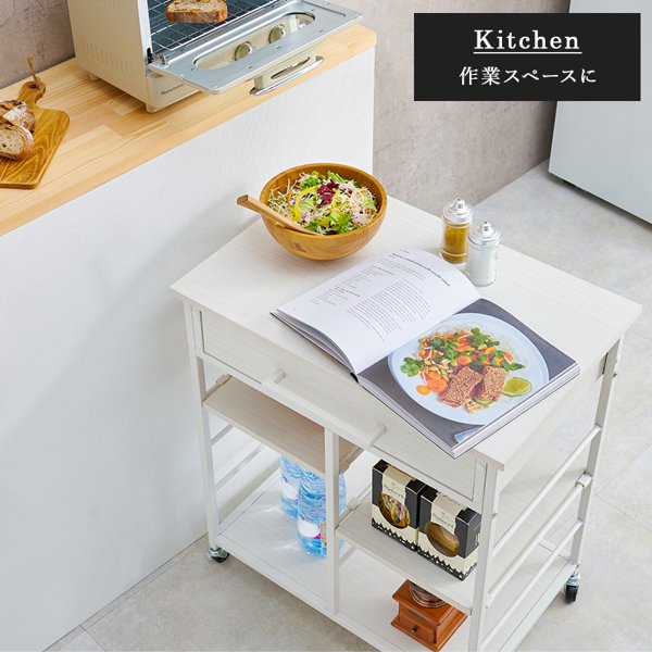 作業スペースや補助テーブルとしても快適な広々天板のキッチンワゴン。カトラリーなどを収納できる引出付き。配達業者を指定いただくことはできません。北海道/沖縄/離島のお届けに別途中継料金が発生します。※別途送料が発生する場合は後ほどご連絡させていただきます。当店は正規店です。タイミングによっては在庫切れの場合があります。"}
