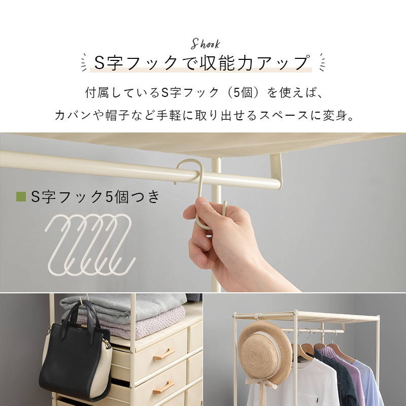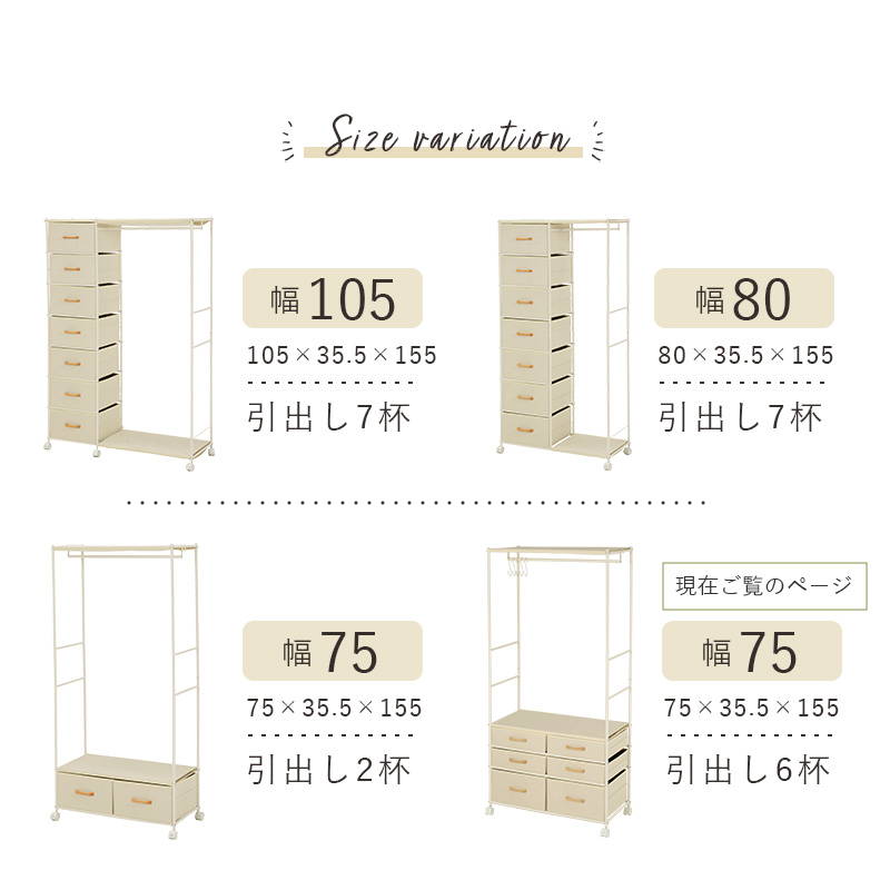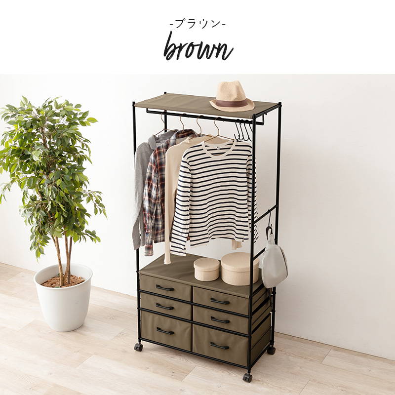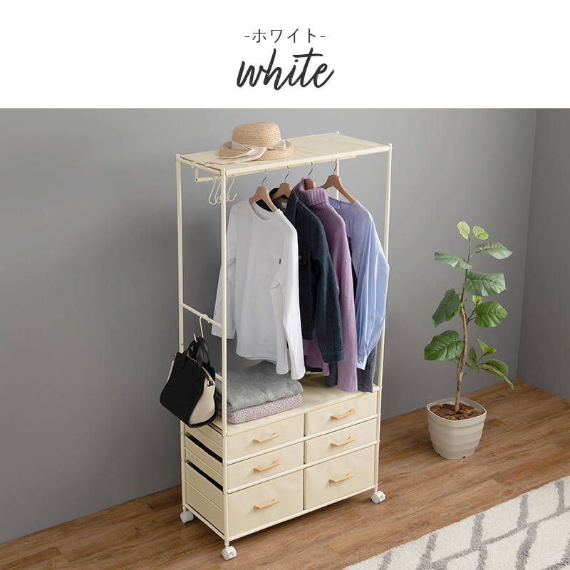 ハンガーラック 引き出し6杯付き コンパクト 幅75cm S字フック5個 キャスター付き