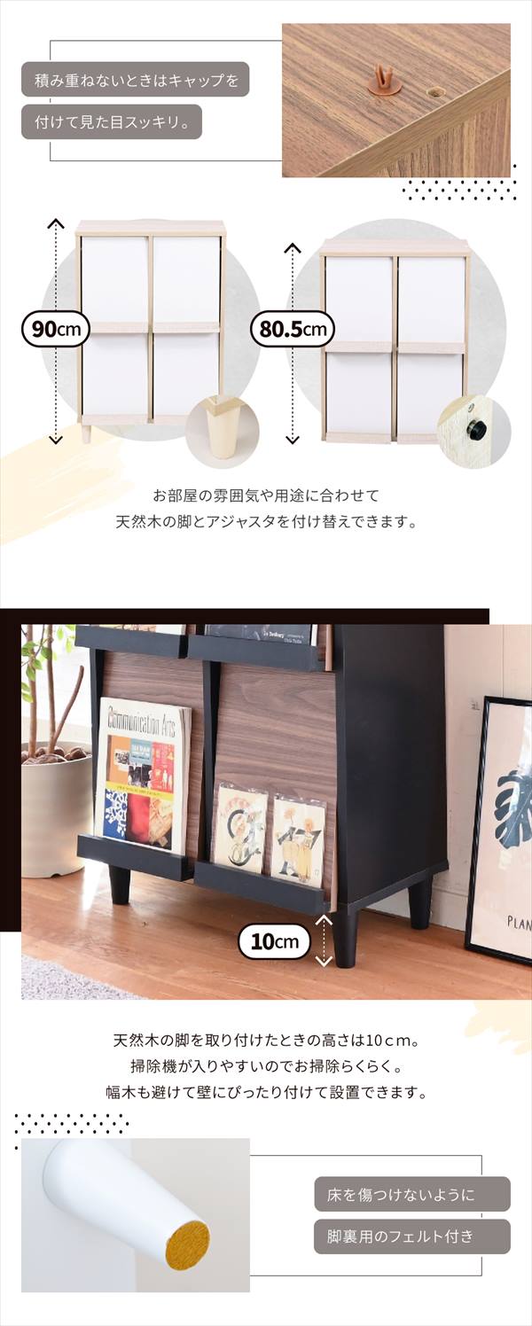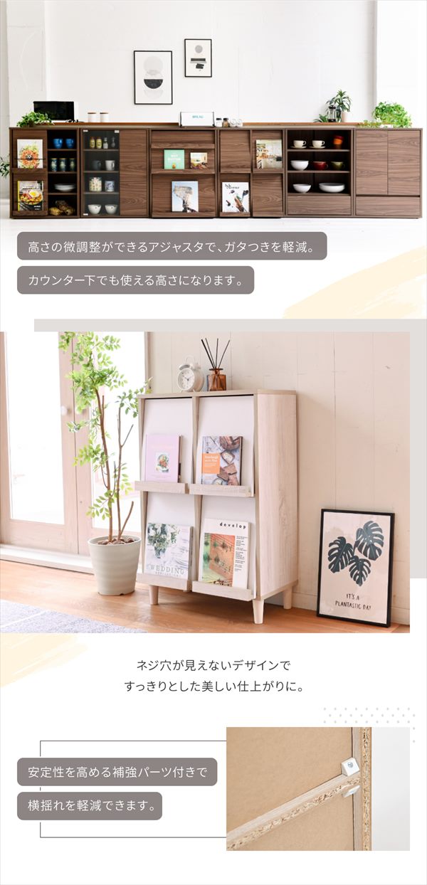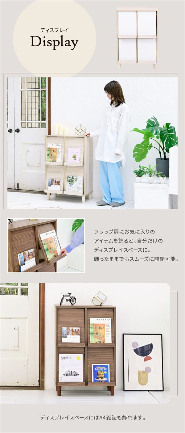 4フラップキャビネット。6つのデザインと5つのカラーからお選びいただける6デザインキャビネット”Adatto”。扉部分には雑誌やポストカードなどお好みのディスプレイを。商品名:Adatto 4フラップタイプ ラック 幅60cmカラー:ブラック×ブラウン/ナチュラル/ホワイト/ブラウン/ナチュラル×ホワイト サイズ:幅60×奥行35.5×高さ90(アジャスター80.5)cm材質: 本体:プリント紙化粧合板 天板・扉:合成樹脂化粧合板(PVC) 脚:天然木収納量・耐荷重:天板:約10kg以下 フラップ扉:各約1.5kg以下 扉内固定棚:各約5kg以下備考:・背面化粧なし ・脚裏フェルト付き ・アジャスター付き生産国:中国組立時間(目安)(大人2人)お客様組立(40分)■送料:全国無料※沖縄・離島へのお届けは別途送料が必要になりますので、事前にお問い合わせください。FSI-0003 サイドボード モダン キャビネット 扉付き ディスプレイラック スリムこちらの商品は[Adatto 4フラップタイプ ラック 幅60cm]になります。