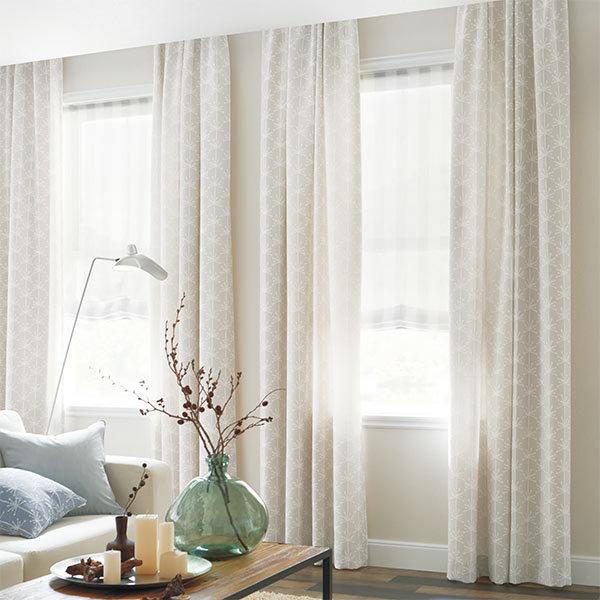 大きな幾何学柄のプリント生地。シンプルな色使いがモダンな商品です。約2倍ヒダ(本縫い)裾:折返しタッセル含む。片開き最大製作巾は300cm。組成|ポリエステル100%※写真はイメージ画像です。実際の販売ページの縫製スタイルとは異なる写真の場合があります。"} ●写真はイメージです。ディスプレイの設定等により色の見え方等が変わる場合がありますがイメージ違いによる返品や交換はできません。