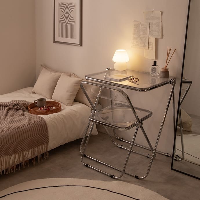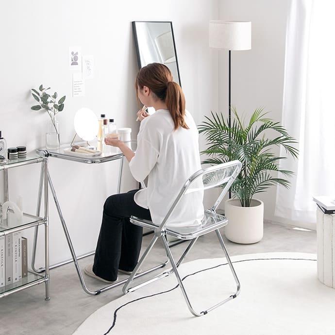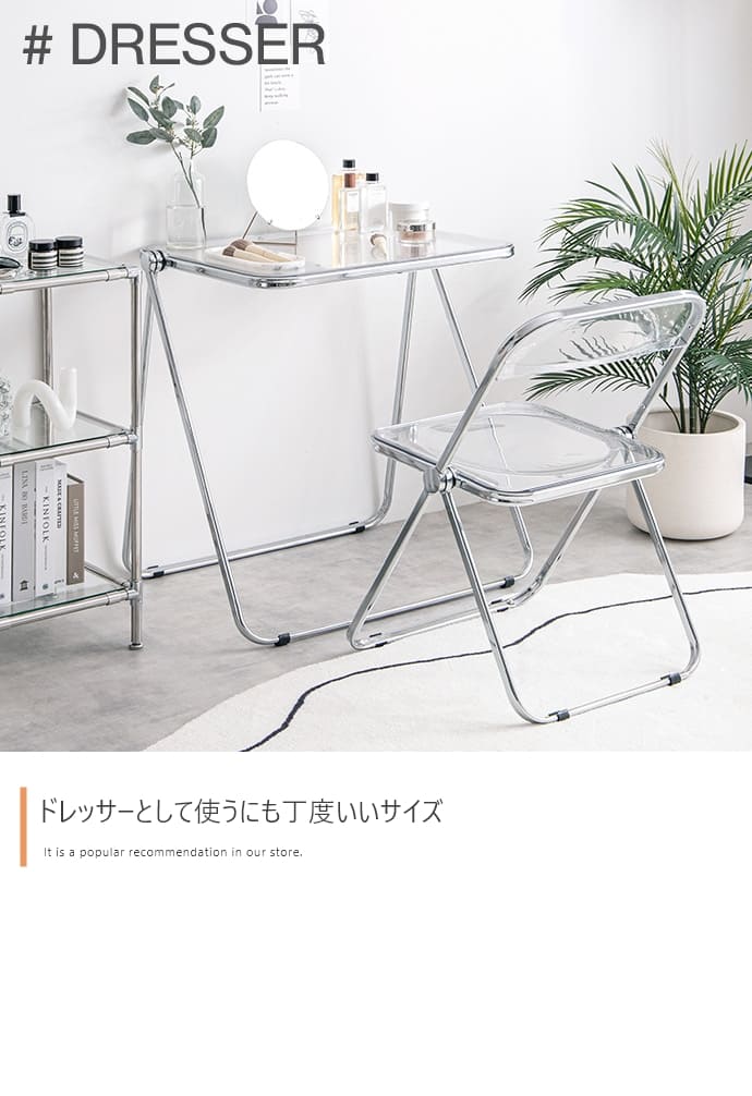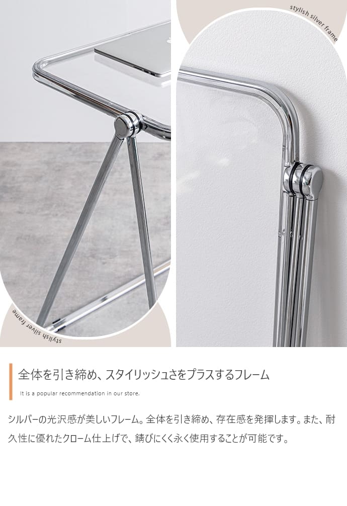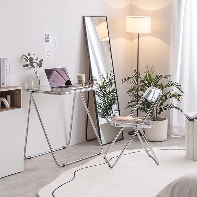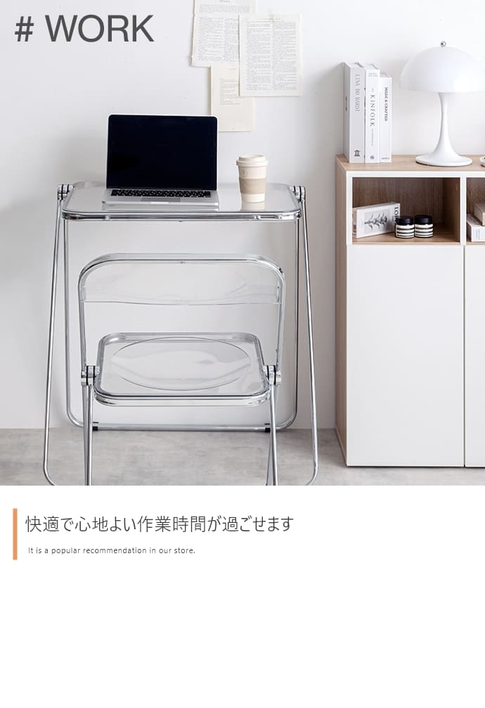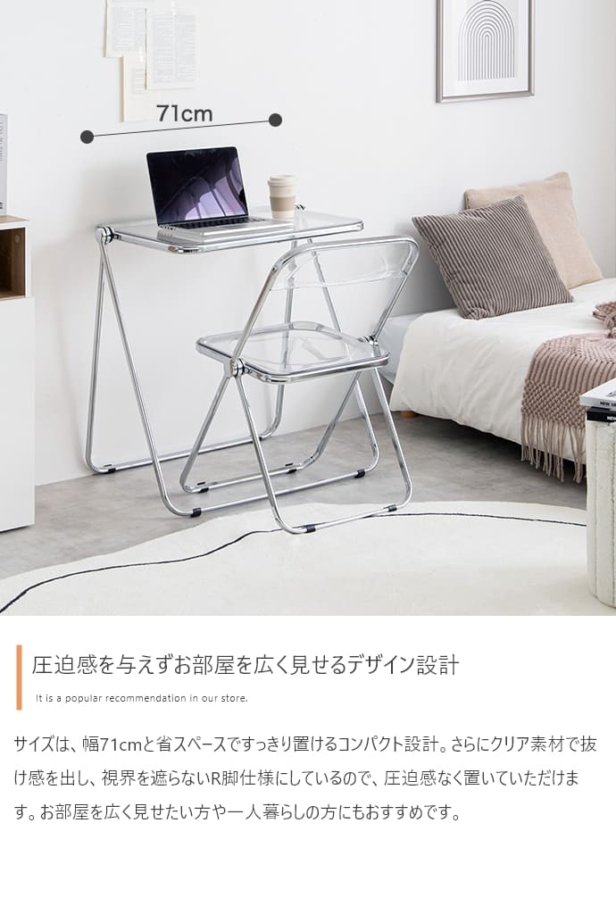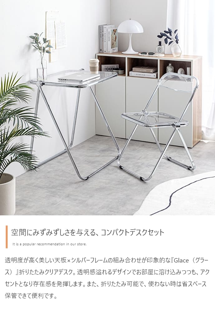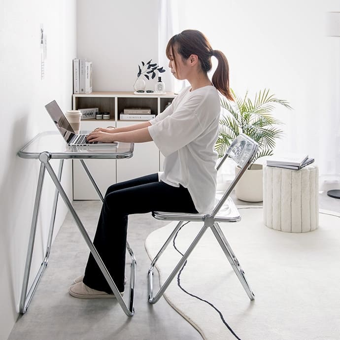 透明感ある美しい天板とシルバーフレームの組み合わせが印象的な、折りたたみクリアデスク。透明感あふれるデザインは、空間に溶け込みつつも、お部屋のアクセントとなります。また、折りたたみ式なので省スペースで収納が可能。見える場所にたたんで置いておいても生活感が抑えられるので、保管場所に困りません。さらに、クリア素材使用で空間を広く見せることができるので、一人暮らしの方やお部屋を広く見せたい方にもおすすめです。
