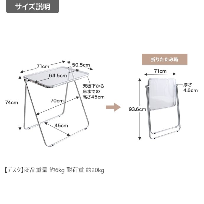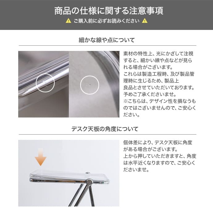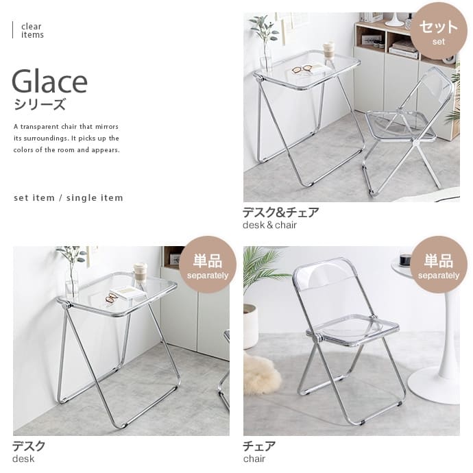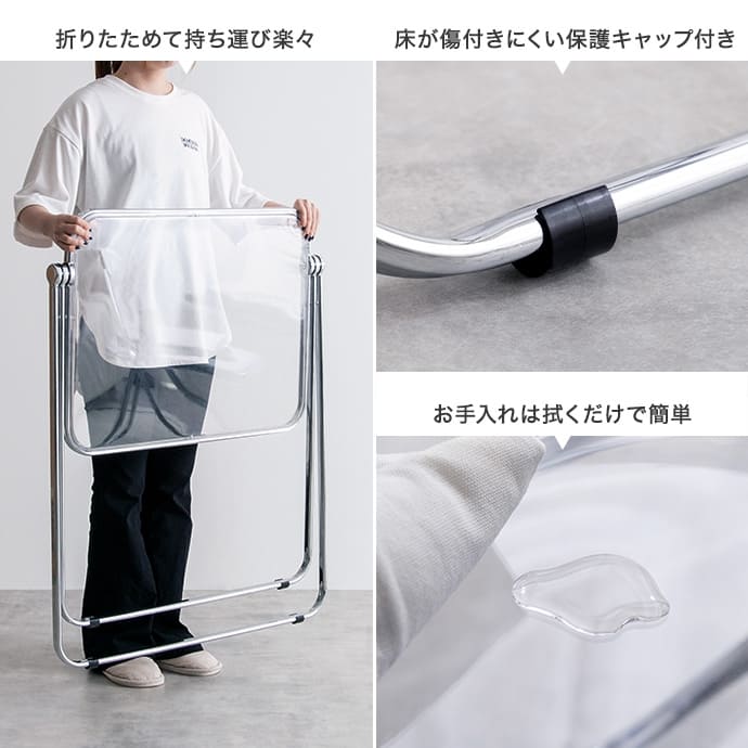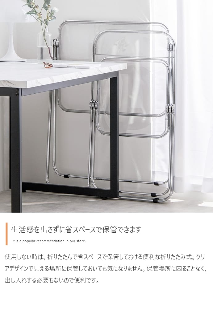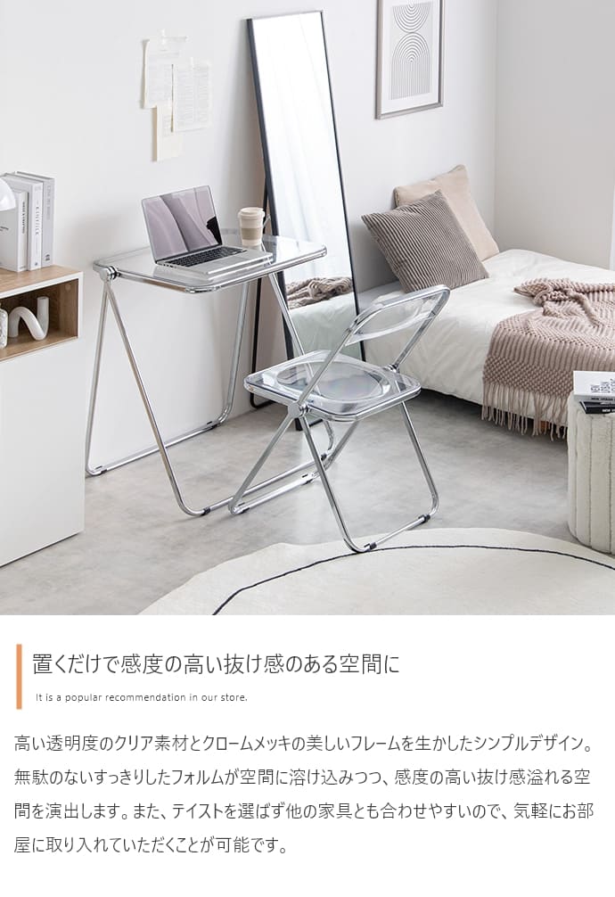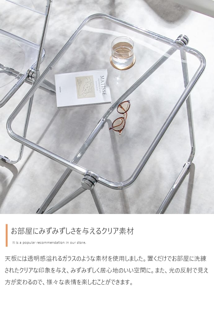 折りたたみクリアテーブルスケルトンフォールディングテーブル 透明感 スケルトンテーブル コンパクトテーブル 在宅ワーク クリア 透ける インテリア キレイ トウメイ 重ねる 収納可能 コンパクト 省スペース オフィス 北欧風 映える 母の日クリア素材使用で空間を広く見せることができるので、一人暮らしの方やお部屋を広く見せたい方にもおすすめです。■<工具不要>3分で完成するベッドフレーム!■整理整頓の魔法、新しいキッチン収納で生活を軽やかに!■テレビスタンドの常識を覆す、新たなスタンダード■トイレがよりすっきり、生活感のない快適な空間へ。■ランドリー・サニタリーアイテム■新学期の準備■心地よい緑のオアシスで、リフレッシュとリラックスを体験しよう。■すやすや快眠マットレス配送について>> ご購入前の確認事項>>注意:モニターの発色によって、多少お色味が異なる場合がございます。透明感ある美しい天板とシルバーフレームの組み合わせが印象的な、折りたたみクリアデスク。透明感あふれるデザインは、空間に溶け込みつつも、お部屋のアクセントとなります。また…"}