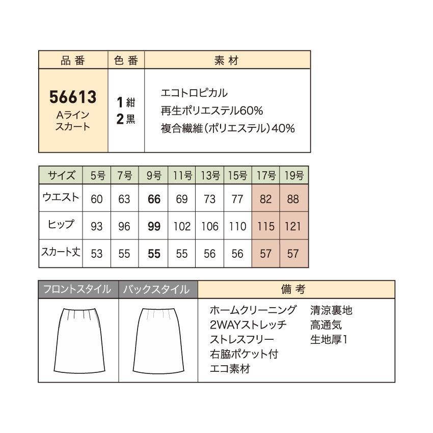 メーカー:ジョア品番:56613-1 56613-2商品名:Aラインスカート性別:レディース季節:春夏素材:エコトロピカル 再生ポリエステル60%複合繊維(ポリエステル)40%ホームクリーニング 2WAYストレッチ ストレスフリー 右脇ポケット付き エコ素材 ホック