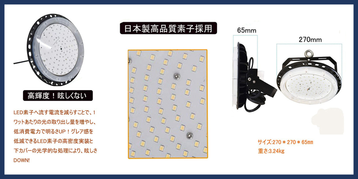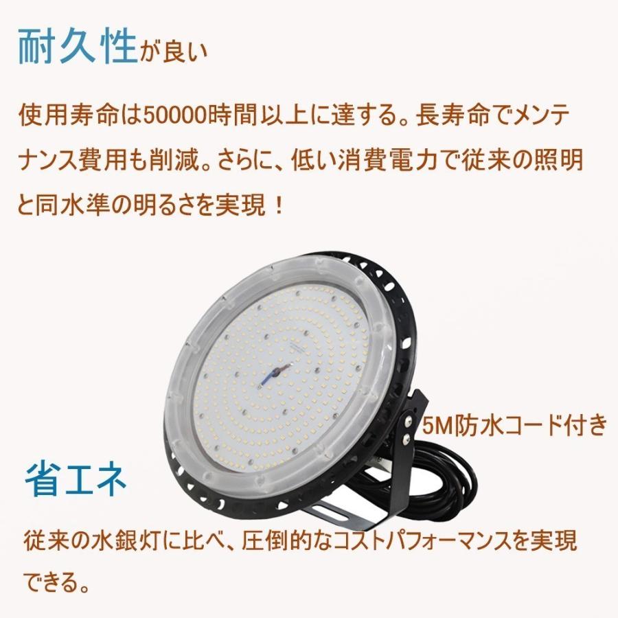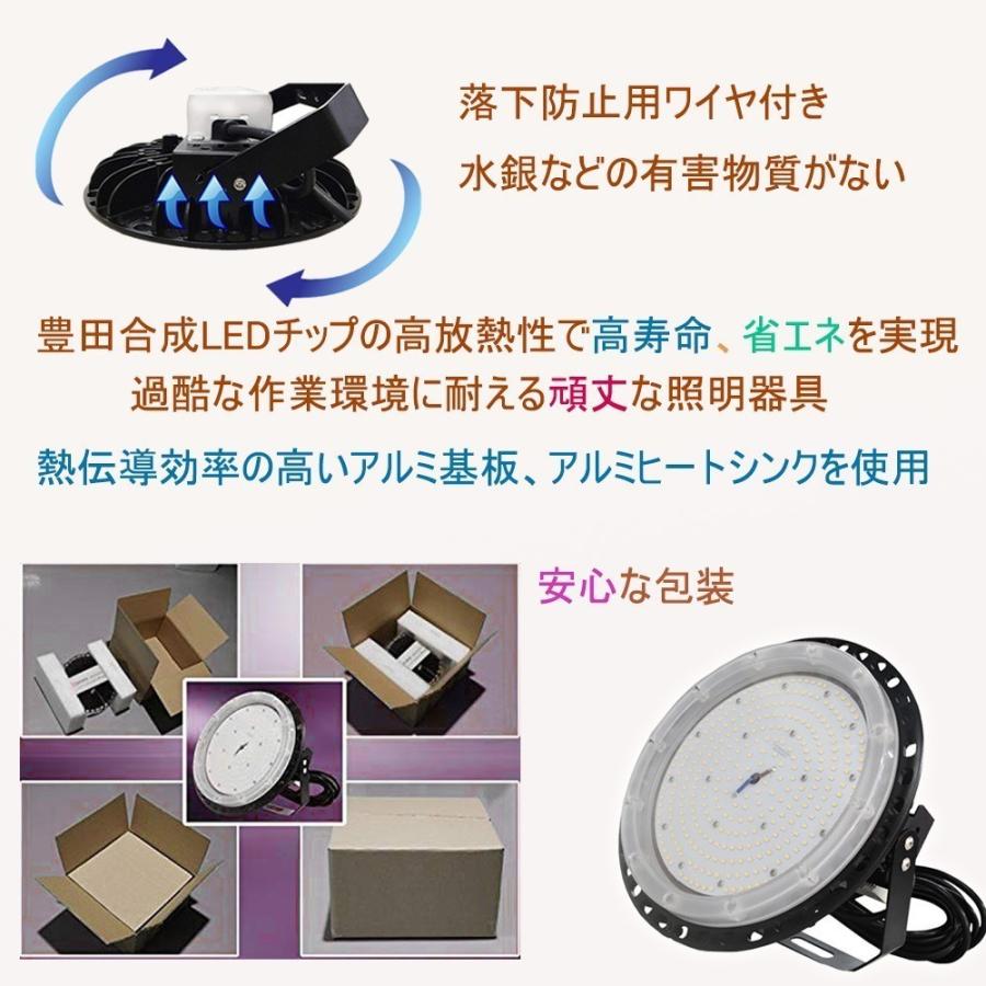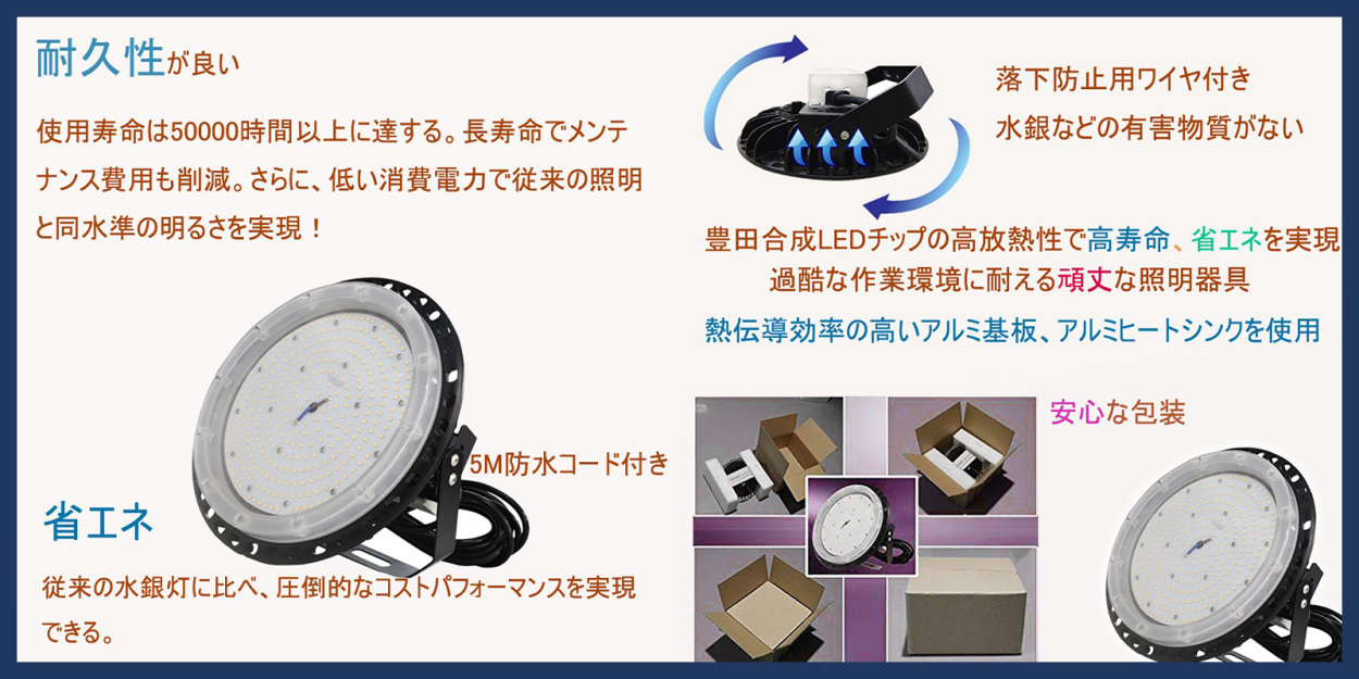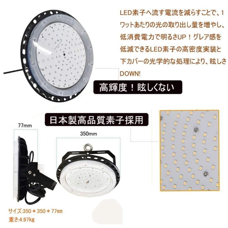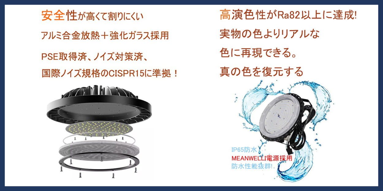 150W UFO型LED高天井器具・丸型、円盤型高天井照明・高天井灯 【製品仕様】●消費電力: 150W/1500WLEDハイベイ照明代わり●重量:4.97KG/サイズ:350*350*77mm●電源:Meanwell電源(防水性能抜群)●入力電圧:AC85〜265V ●周波数:50-60Hz ●色温度:昼白色5000K●照射角度:120度 ●旋転でき:270度 ●演色性:Ra82以上,真の色を復元する。●電磁波障害なし ノイズなし ●使用環境湿度:90%以下●認証:PSE取得●5m防水コード付き ●IP65防雨防水防塵●2年間製品保証 省エネ、無騒音●使用寿命:50000時間以上【キーワード検索】ufo型 led投光器 ハイベイライト LED高天井照明 吊下げタイプ 工事現場作業用 倉庫用 工場用 看板用 天井用 防水LED 工場作業灯 防塵投光器 ワークライト投光器 作業灯 防雨型 LEDハイベイ照明 水銀灯 夜間作業ランプ 1500Wバラストレス水銀灯相当 150Wペンダントライト ダウンライト 水銀灯からledへ交換 水銀灯led 水銀灯led化 水銀灯1500w"}