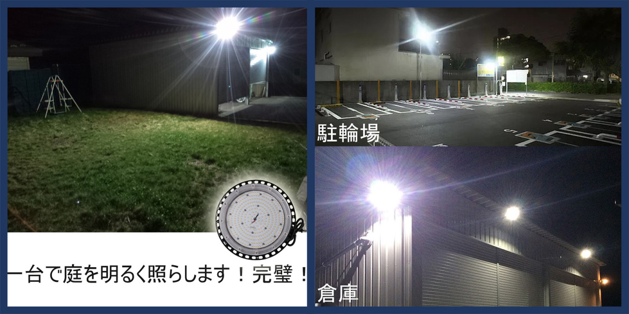 夜間作業灯、駐車場、公園、運動場、体育館、広場、倉庫、天井照明、ホール、工場、物流センター、工事現場、トンネル内点検、農場、屋外広告灯、ポーチ、歩道、庭園、温室、ガーデン、デッキ、階段、ガレージ、私道、裁判所、防犯灯様々場所に活躍