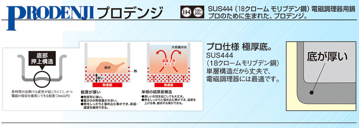 PRODENJI プロデンジSUS444(18クローム モリブデン鋼)電磁調理器用鍋[IH]プロのために生まれた、プロデンジ。プロ仕様 極厚底。単層構造だから丈夫で、電磁調理器には最適です。※電磁調理器対応<BR>●サイズ表示(外径cm):27<BR>●外径×深さ(mm):270×100<BR>●容量(L):4.3<BR>●質量(kg):1.8<BR>●底板厚(mm):2.5<BR>●底径(mm):210"}
