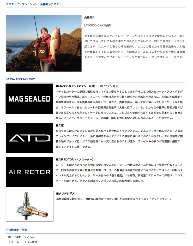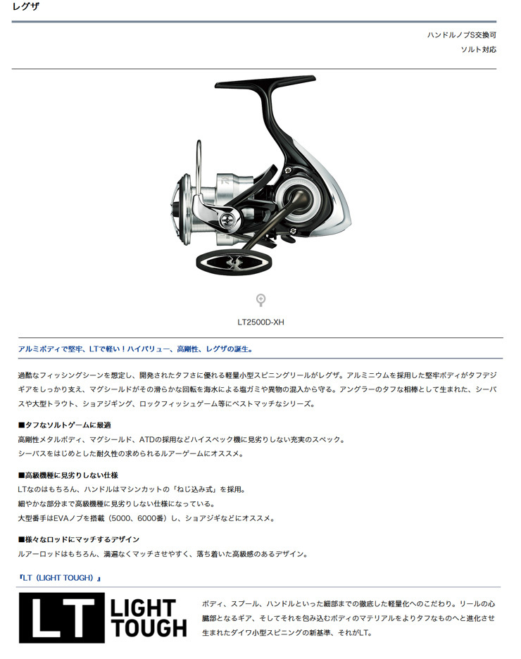 ■タフなソルトゲームに最適高剛性メタルボディ、マグシールド、ATDの採用などハイスペック機に見劣りしない充実のスペック。シーバスをはじめとした耐久性の求められるルアーゲームにオススメ。■高級機種に見劣りしない仕様LTなのはもちろん、ハンドルはマシンカットの「ねじ込み式」を採用。細やかな部分まで高級機種に見劣りしない仕様になっている。大型番手はEVAノブを搭載(5000、6000番)し、ショアジギなどにオススメ。■様々なロッドにマッチするデザインルアーロッドはもちろん、満遍なくマッチさせやすく、落ち着いた高級感のあるデザイン。