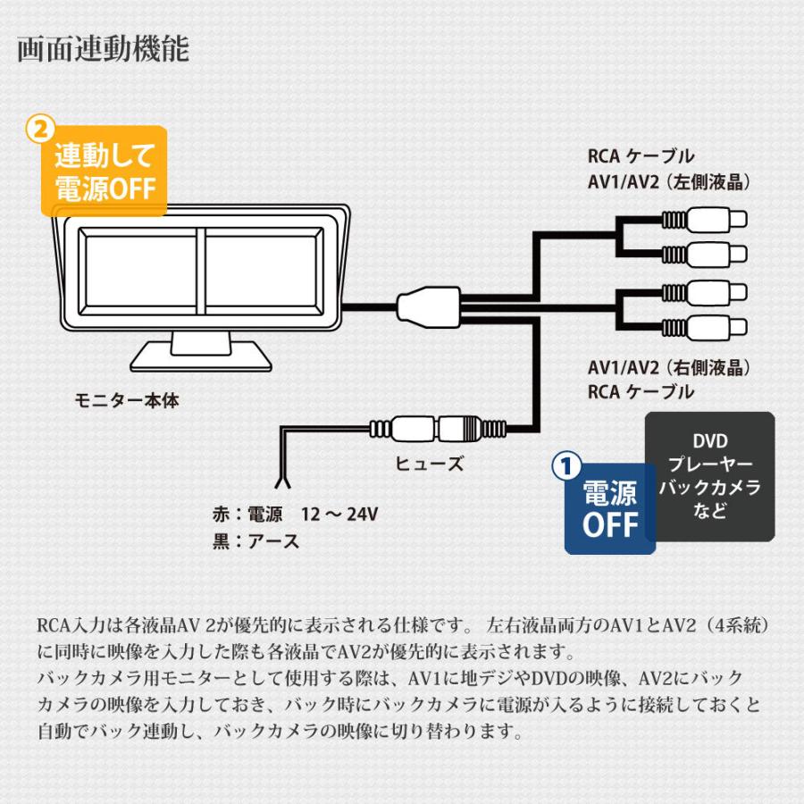 ・4.3インチ2画面で別々の映像を流せます。・光の反射・映り込みを軽減する遮光フード一体型・12V−24V対応・映像入力4系統だからバック時にバックカメラの連動も可能動作電圧DC12V-24V動作温度-10℃〜+60℃消費電力最大6W画面解像度480RGB×234映像入力四系統(AV1,AV2)×2液晶画面使用4.3インチ TFT LCD◆バックカメラ仕様動作電圧 DC12V〜24Vチップ PC7440Hチップ解像度 640×480信号方式 NTSC防水防塵レベル IP67視野角 120度最低照度 0.1LUX動作温度 -20〜+80 RH95%Max・防水機能・ガイドライン表示切り替え対応あり・正像/鏡像切り替え対応■トラック用 天井吊り下げ式モニタースタンドトラックの純正ミラー部分に取り付けできるモニタースタンド。車載用モニターを吊り下げて取り付けできます。◆製品仕様製品寸法:(約)160×120×65mm製品重量:(約)235g"}