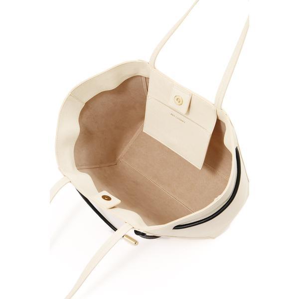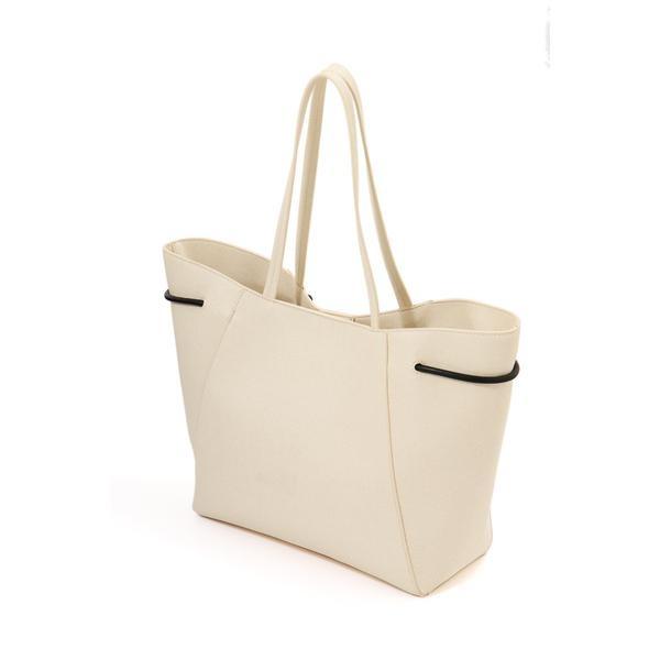 デイリーからカジュアルな通勤スタイルにも活躍できるトートバッグ貼り合わせ加工を入れた素材で、中に収納したモノが表に響きにくく、必需品をすっきりおまとめできます。A4ファイルや書類なども収納できる便利なサイズ感。内側はすぐに取り出したい鍵や定期などが入れられるアウトポケット付き。黒と配色が効いたホワイトカラーのみ、WEB限定色でございます。