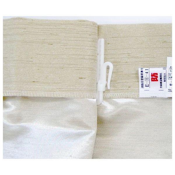 | 共布タッセル (1枚組には1枚、 2枚組には2枚つきます。) | アジャスターフック Bタイプ 14個 このカーテンには、アジャスターフックを使用していますので 裾の位置をお手元で調節することができます。 ほぼ5mm間隔で、約4cm程度裾を下げることができます |