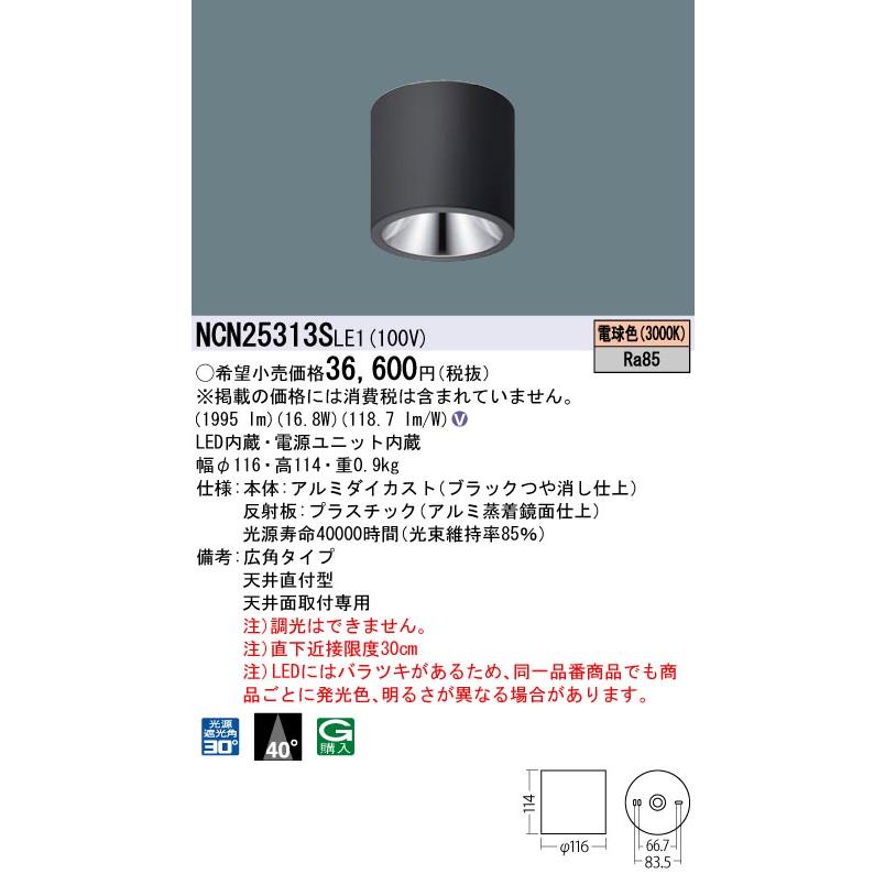 [法人限定] NCN25313S LE1 パナソニックスポットライト 天井直付 電球色 小型シーリングライト ビーム角40度 広角 光源遮光角30度 [ NCN25313SLE1 ]