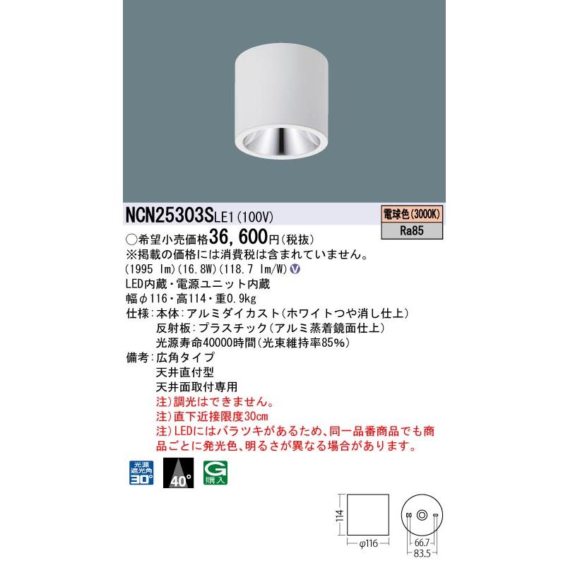 [法人限定] NCN25303S LE1 パナソニックスポットライト 天井直付 電球色 小型シーリングライト ビーム角40度 広角 光源遮光角30度 [ NCN25303SLE1 ]