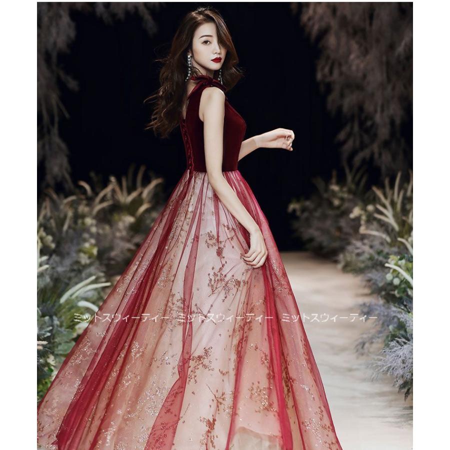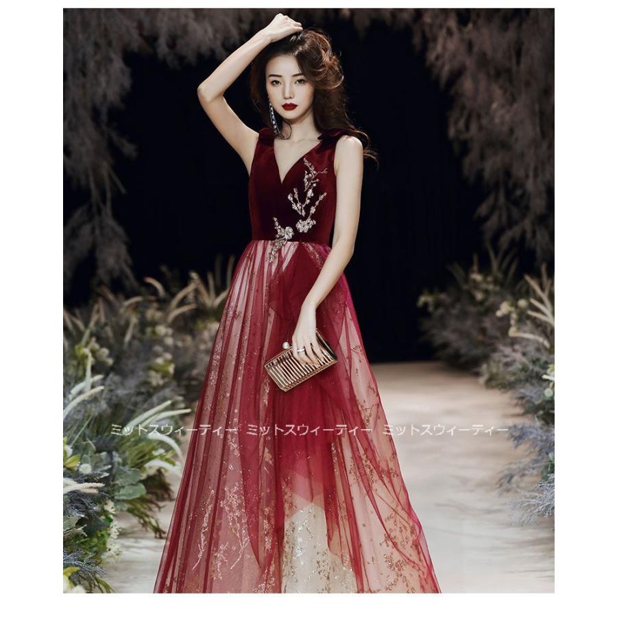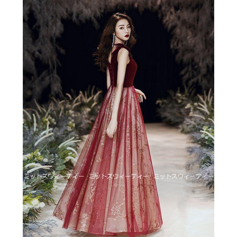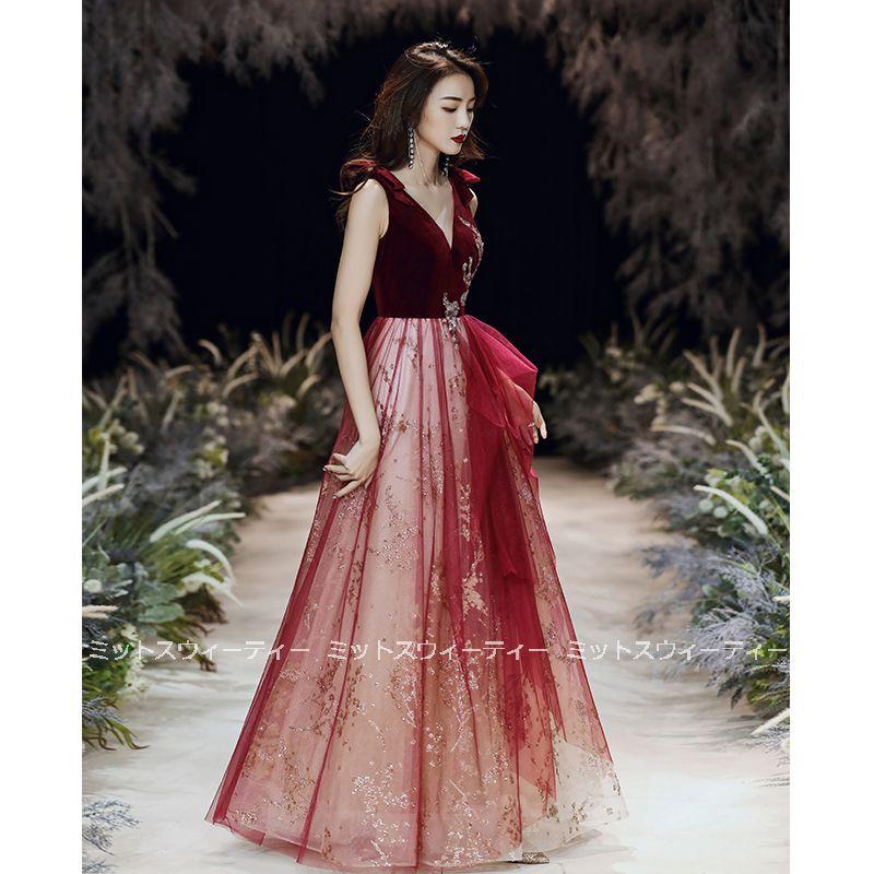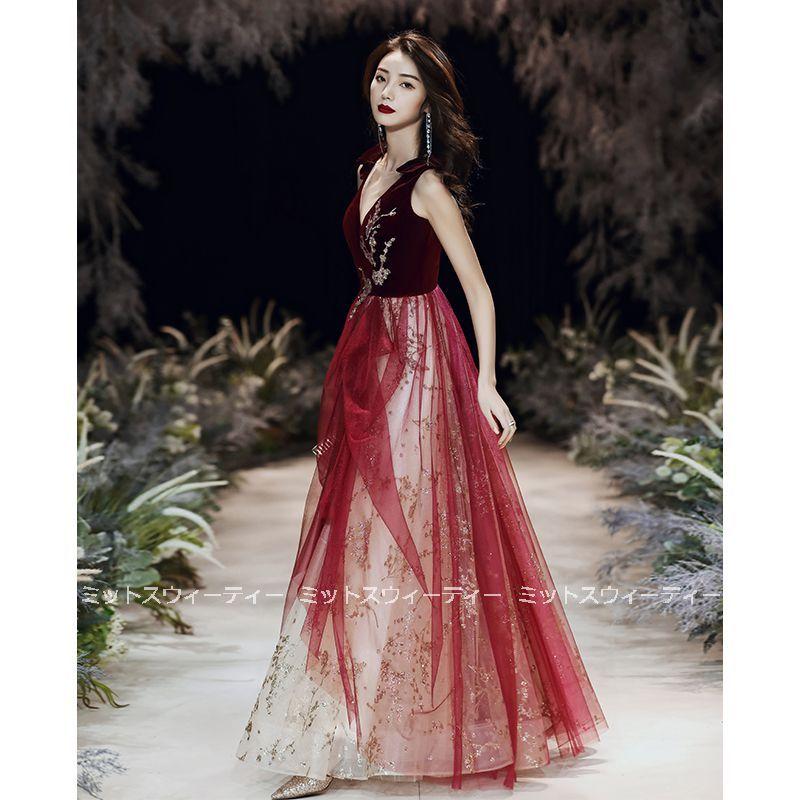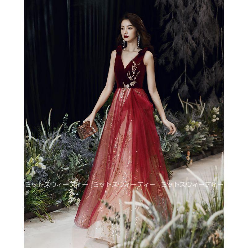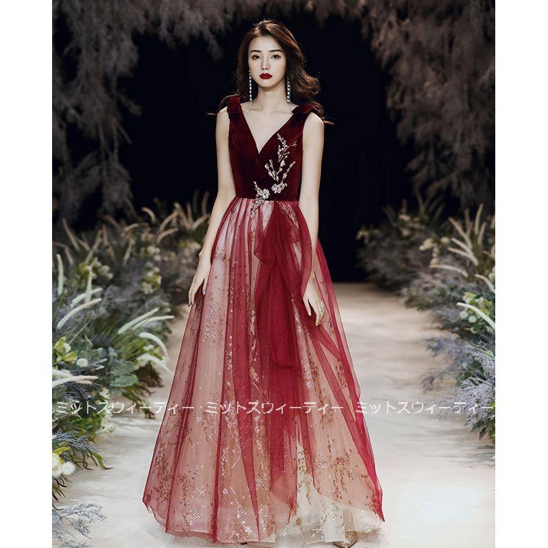 花嫁 ロングドレス カラードレス チュール ベルベット 演奏会 赤 ワインレッド 結婚式 二次会 パーティードレス 披露宴 発表会 イブニングドレス Vネック 大人