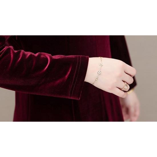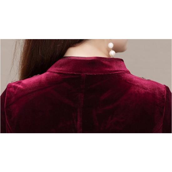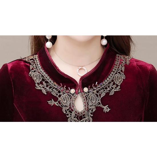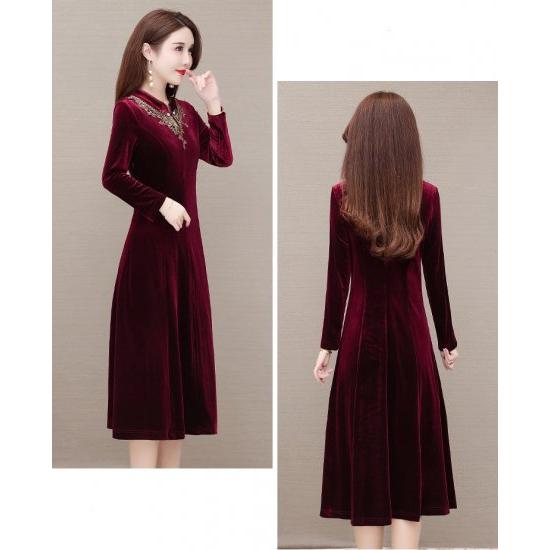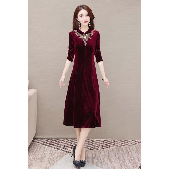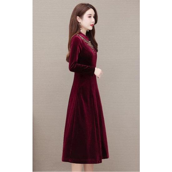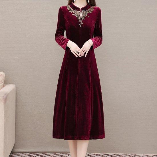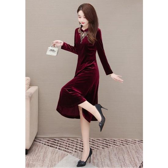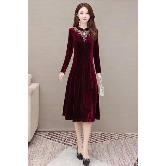 ベルベットドレス パーティドレス チャイナドレス ひざ下丈 長袖 Iライン 刺繍 大きいサイズ レディース エレガント 華やか 上品