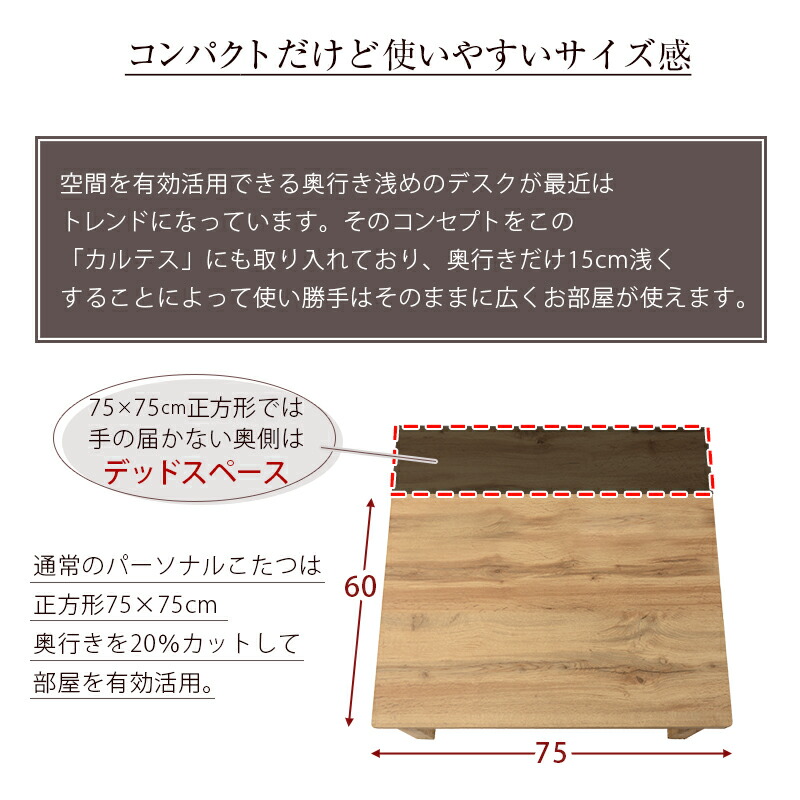 カジュアル コタツ カルテス7560 こたつ テーブル ナチュラル 木目 ウッド ヴィンテージ コンパクト 幅75 奥行60 長方形 通販 こたつテーブル 長方形 こたつテーブル おしゃれ シンプル 北欧風 レトロ 1人暮らし 家具調こたつ 1人用こたつコタツ 炬燵リアルな木目の素材感を再現したナチュラルテイスト。一人暮らしにピッタリのサイズ感リアルな木目の素材感を再現したナチュラルテイスト。一人暮らしにピッタリのサイズ感商品管理番号 カルテス7560生産地 本体:インドネシア製、ヒーター:マレーシア製サイズ (約)幅75×奥行60×高さ36.5cm素材 天板:プリント紙化粧繊維板合成樹脂化粧繊維板(塩化ビニル)、ヒーター:MS-303H300W石英管ヒーター(中間スイッチ)内寸及び補足説明 ■組立式送料・配送について ■この商品は送料無料です(※ただし北海道・沖縄・離島は別途送料お見積します。ご注文前にお問い合わせ下さい。)