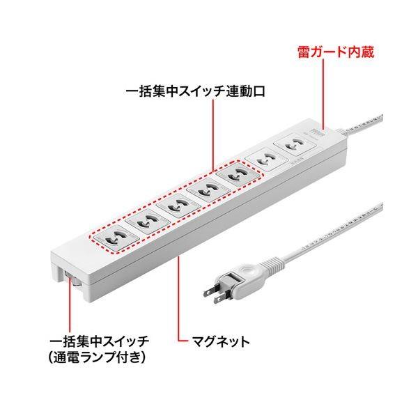 ●ケーブル長さ2m。スイッチ連動口に接続した5個の機器の電源を、まとめてON・OFFできる一括集中スイッチ付き。2個口は常時通電口(差込口が白色)となっており、常に通電している機器の接続に便利。