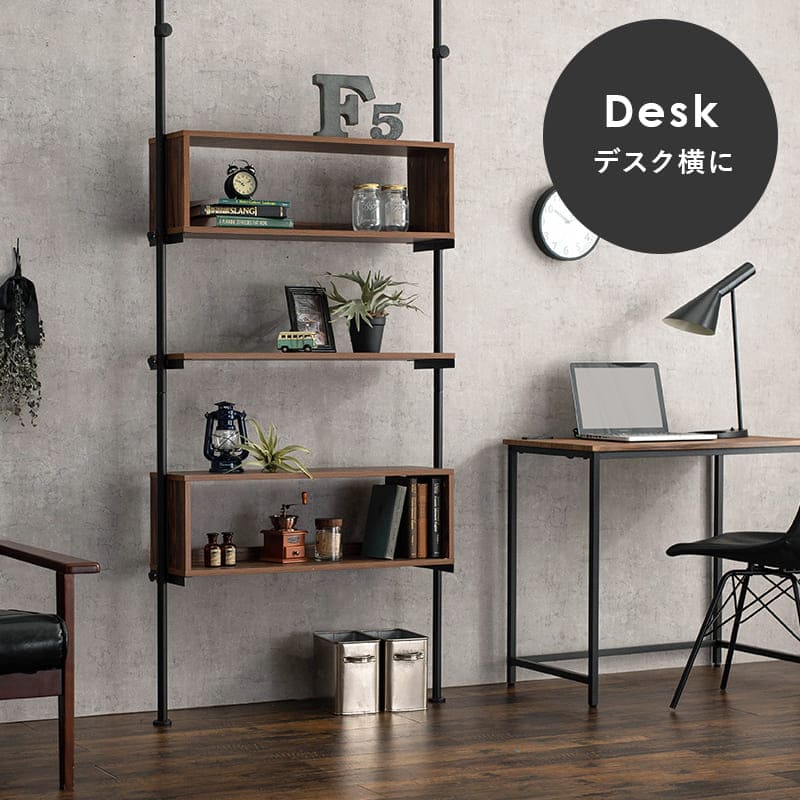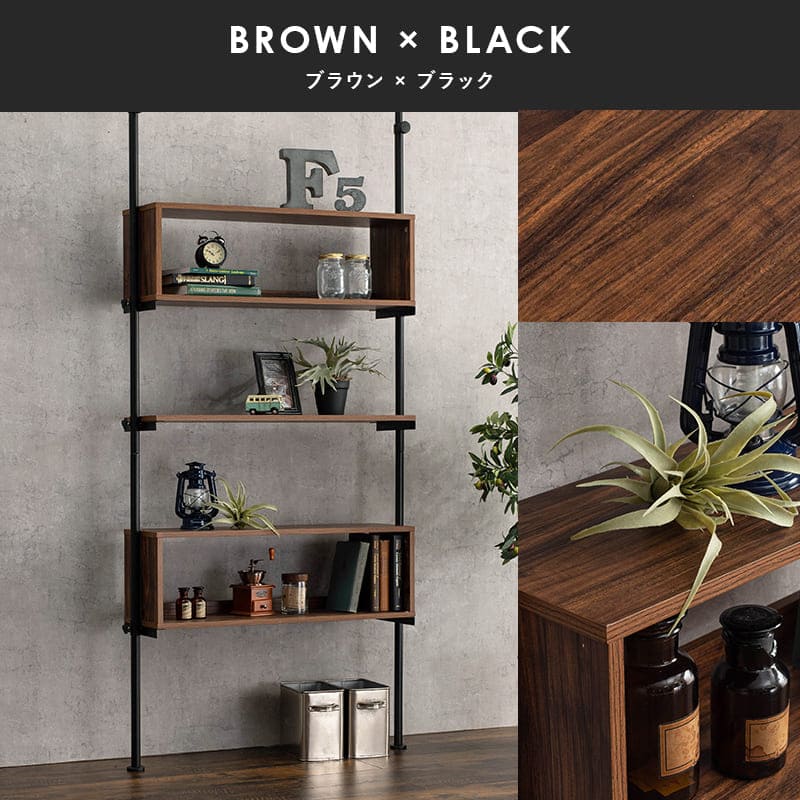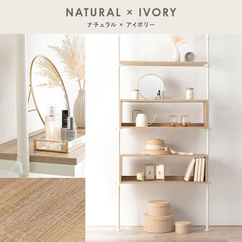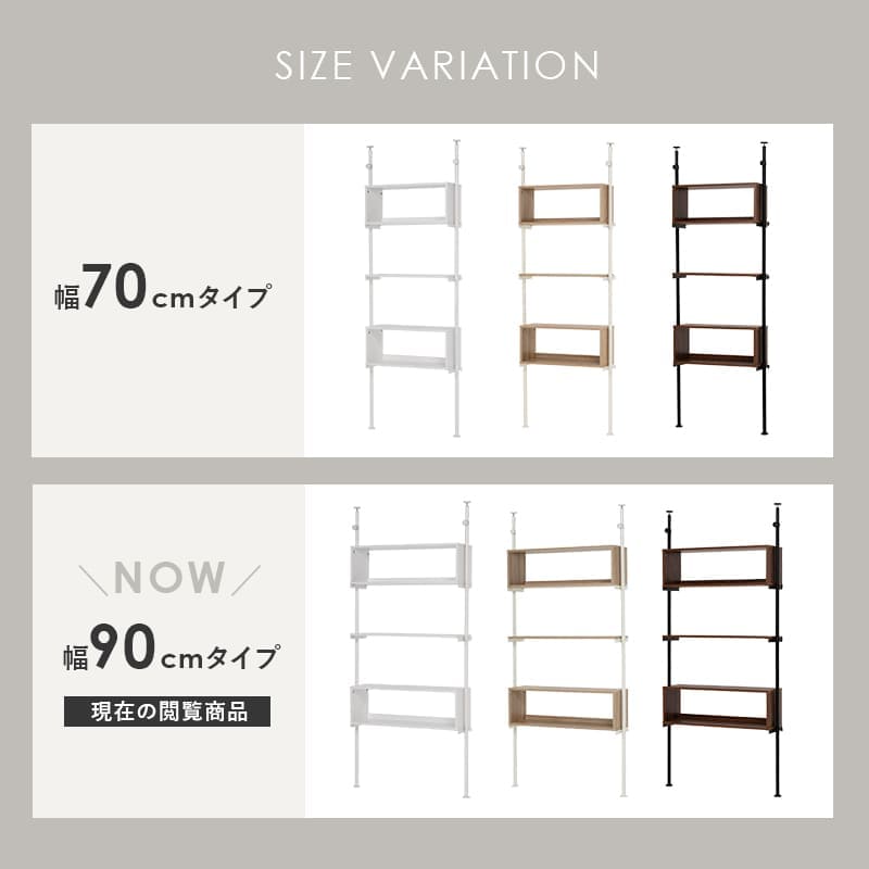 突っ張りラック 壁面収納 ウォールラック 幅90cm 奥行24cm 高さ187~264cm 突っ張り棒 収納 本棚 収納 家具 ラック 賃貸家具 お洒落 木目調 間仕切り デスク シンプル サイズ調節可能 組み立て式 スペースボックス収納とオープン棚でおしゃれにディスプレイできる、突っ張りラック。高さ無段階調整可能。