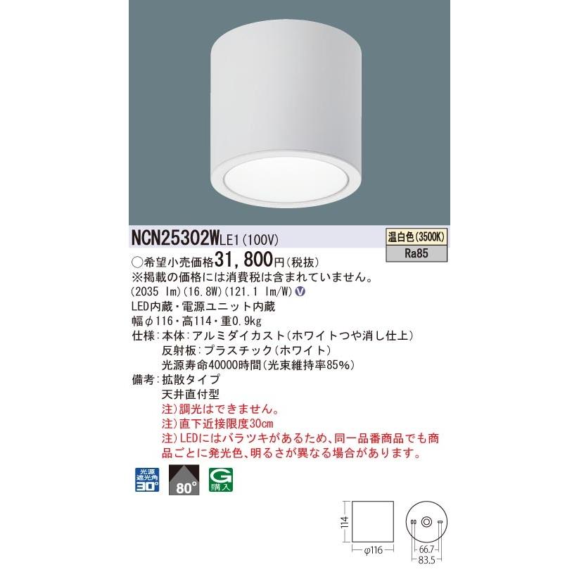 【法人様限定商品】パナソニック NCN25302WLE1 LED小型シーリングライト 天井直付型 ビーム角80度・拡散 温白色