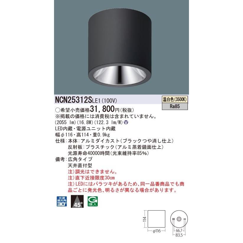 【法人様限定商品】パナソニック NCN25312SLE1 LED小型シーリングライト 天井直付型 ビーム角45度 広角 温白色