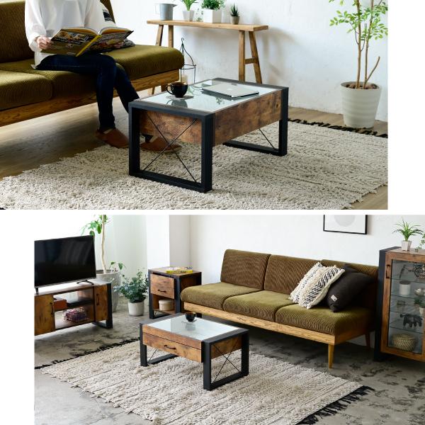 ■商品説明 おしゃれなカフェの雰囲気を演出できる、ヴィンテージ風シートがクールなブルックリンスタイルのコレクションテーブル。無骨すぎないデザインで男女問わずご使用いただけます。強化ガラスで耐久性もばっちり。雑誌などを収納するだけで映えるのが嬉しい!■本体サイズ [外寸]幅75.5×奥行47.5×高さ35.5cm■組立時間(目安)(大人2人) お客様組立(20分)■キーワード ガラステーブル ビンテージ風 ヴィンテージ ヴィンテージ風 ビンテージ アメリカンヴィンテージ アンティーク インダストリアル 木製 木目 木目調 おしゃれ 収納 お洒落 黒 ブラック ダークブラウン ブラウン 茶色 茶 脚 アイアン ブラックアイアン スチール 鉄 木 ソファ 二人暮らし ひとり暮らし ノートパソコン 四角 ガラス天板 ガラストップ 雑貨 重厚感 勉強 パソコン 引き出し付 ひきだし リビング 見せる収納 木材 pc コレクション 強化ガラス天板 ラック リモコン ディスプレイ 雑誌