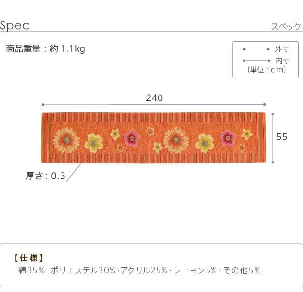 【カラーバリエーション】オレンジ・ベージュ・グリーン・ブラウン【仕様】綿35%・ポリエステル30%・アクリル25%・レーヨン5%・その他5%【サイズ】240x55cm厚さ:約0.3cm重量:約1.1kg▼茶色 緑 イタリア カラフル 花柄 柄物 約 45cm 240cm 幅45 幅240 長方形 ロングマット クッションフロア クッションマット クッションタイプ ミニラグマット 台所マット キッチンラグ オシャレ カラー 材質 サイズ 北 南 東 西 安い 業務用 北欧風 北欧スタイル 北欧モダン 北欧柄 西海岸 アジアン ナチュラル ハワイ ハワイアン 和 和風 和風モダン 個性的 薄い 薄手 小さめ ミニ 大きい 大きめ ワイド 幅広 ロングサイズ ロング 長い 長め 短め スリム 隙間 高さ 防音 滑らない ふける 水拭き ふわふわ ダイニング 台所 キッチン 格安 激安 やすい お洒落 オシャレ おしゃれな 可愛い かわいい カワイイ インテリア 新品 高級感 送料込み 送料無料 単身用 新居 業務用 事務所 家庭用 新生活 仕事用 生活 頑丈 丈夫 一人暮らし用 スリムタイプ スリム型 省スペース コンパクト 夏用 夏 冬用 冬 秋 春 ペット 廊下マット 絨毯 ラグ ラグマット カーペット ▲