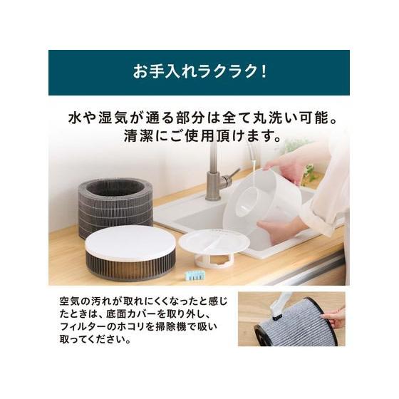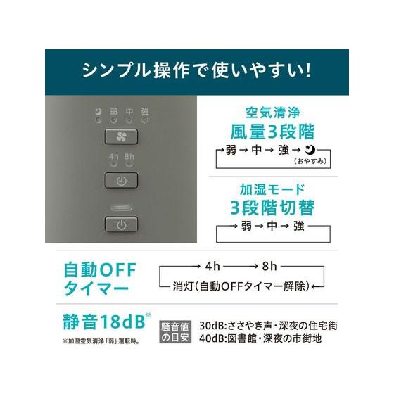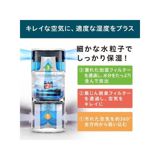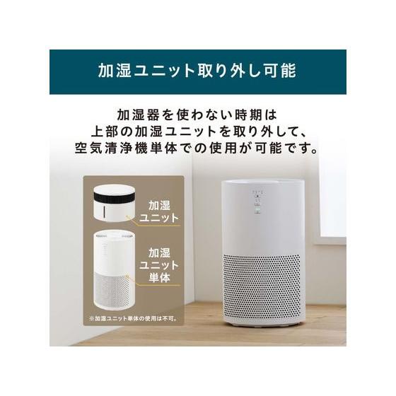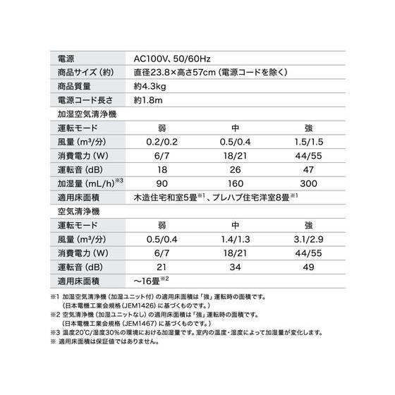 【商品説明】集じん脱臭フィルター(高性能フィルター)で、空気をキレイに!花粉やPM2.5はもちろん、0.3μmの微細な粒子も99.7%以上除去します!加湿ユニットが取り外し可能!加湿ユニットはタンクから、吹き出し口まで全て丸洗いでき、お手入れが非常に簡単です。コンパクトサイズだから持ち運びもラクラクです!おやすみモード付きで、ライトが消えるから就寝の邪魔になりません。【仕様】●電源:AC100V、50/60Hz●消費電力:44W/45W(強)、●適用床面積:木造和室5畳、プレハブ洋室8畳(加湿空気清浄)、〜16畳(空気清浄)●加湿量:300mL/h(強)●タンク容量:2.0L●切タイマー:4.8時間●電源コード長さ:約1.8m●材質:本体樹脂/ABS、フィルター/ABS、PP、PET、活性炭 ad_01