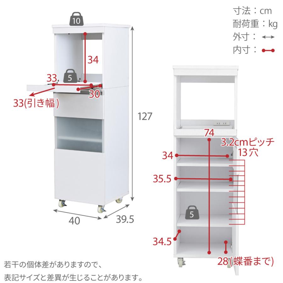 ■商品説明 家電の収納に便利なコンセント付きスライド棚と、収納物に合わせて高さ調節ができる可動棚付きのラックをこれ1台で。ワイドタイプは収納量も抜群。キッチンのちょっとした隙間に設置すれば、それまでのデッドスペースを有効活用できます。■本体サイズ [外寸]幅40×奥行39.5×高さ127cm■組立時間(目安)(大人2人) お客様組立(40分)■キーワード レンジボード キッチン収納 小物 幅40 キッチンラック キャスター 付き 40 40cm 家電収納 ラック 食器棚 コンパクト コンセント付き 高さ 130 cm 奥行き 40センチ スライドトレー 白 ブラウン 隙間収納ラック すき間収納 スキマ 収納 キッチンストッカー スリムストッカー