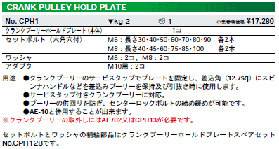■■■■■ご購入前に必ずご確認ください■■■■■PC ⇒ 商品ページ下部の【商品説明】の内容スマホ⇒「すべて見る」をタップし【商品説明】の内容■■■■■■■■■■■■■■■■■■■■■■■■※こちらの画像は代表画像となります。部品や類似品等の場合があります。型番と商品名をご確認下さい。KTC CPH1 クランクプーリーホールドプレート No. CPH1 ▼kg 2 c 1 小売参考価格¥17,280クランクプーリーホールドプレート(本体) 1コセットボルト(六角穴付) M6:長さ30・40・50・60・70・80・90 各2本M8:長さ40・45・60・75・85・100 各2本ワッシャM6:2コ、M8:2コアダプタM10用:2コ