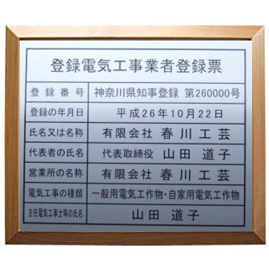 登録電気工事業者登録票 木地額入り・板面はシルバー/登録電気工事業者登録票 お洒落な 登録電気工事業者登録票 額入 登録電気工事業者登録票