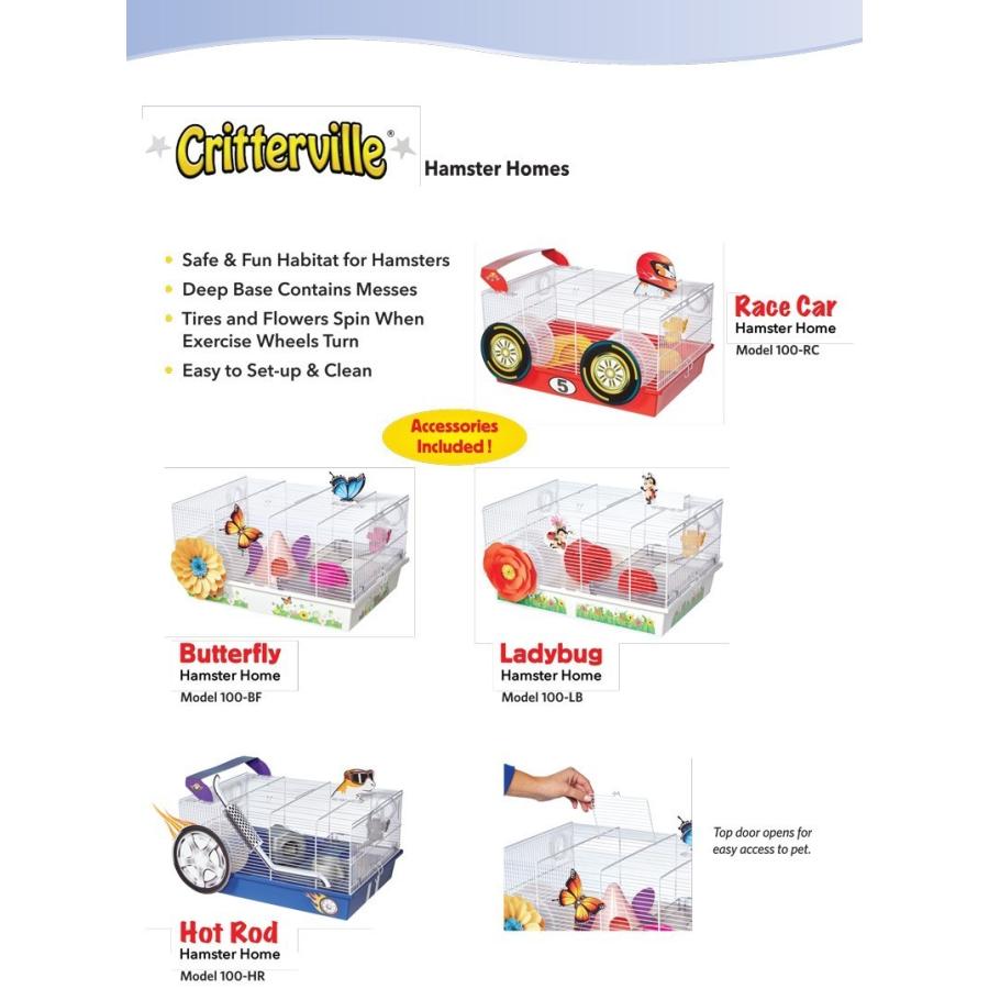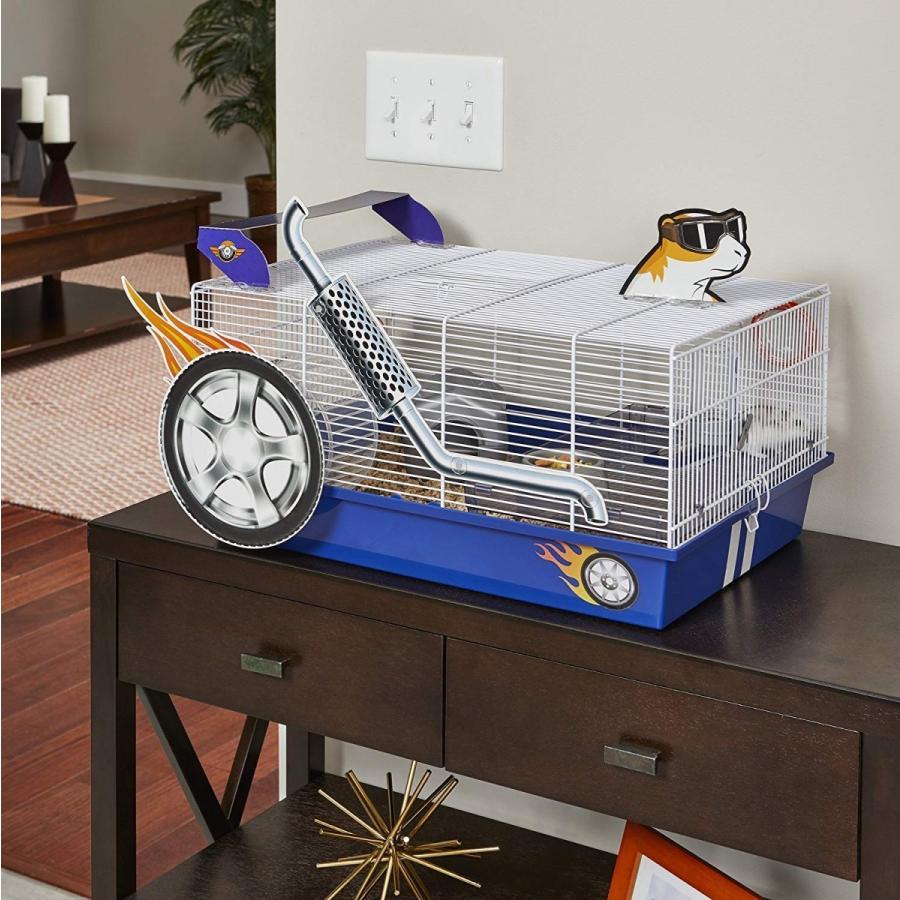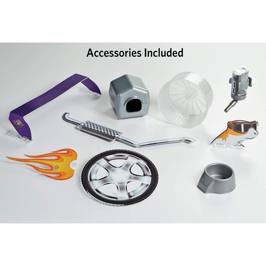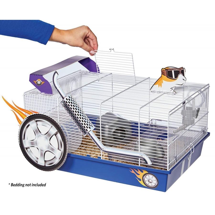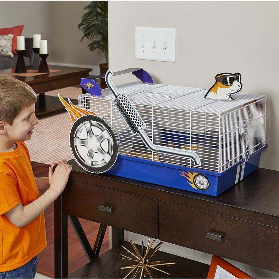【アメリカMIDWEST】アメリカミッドウエスト社ハムスターケージです。 普通のハムスターケージと違い付属のパーツで非常に面白いハムスターケージが完成します。こちらはレース仕様のケージです。 ハムスターホイールに外付けでタイヤが取り付けられることによってハムスターちゃんがホイールで遊ぶたびにタイヤがくるくる回ります。 ケージの入り口はトップにあるのでそこから出入り可能です。人とは違うハムスターケージを御所望の方は是非! サイズ35.1 L x 49.2 W x 24.8 H cm、重量2kg、Includes: Exercise Wheel, Water Bottle, Food Bowl, Shelf, Hideout Hut, Clip-on Art, and Decals"}