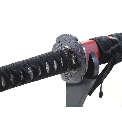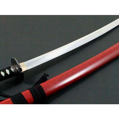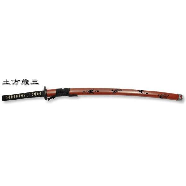 ★デザインが変わりました。鞘の口の部分に金属が付きました。★ 刀身を軽いアルミ刀身に変更できます。アルミ刀身は、軽量で舞踊や演劇に最適!通常の模造刀の約半分の重量になります。ご希望される場合 選択で選んでください。★大刀の鍔を使って小刀もできます。 お問い合わせください。土方歳三は、天保6年武蔵国多摩郡石田村にうまれ、長じて新撰組副長として京都他で活躍、明治2年(1869)5月11日函館五稜郭で戦死しました。幕末のまっただ中を駆け抜けた35年のその生涯は、今でも人々の心の中に生き、慕われています。お得な刀掛け台付きのセットりです。材 質刀身 亜鉛合金(クロムメッキ仕上げ)鯉口・小尻ー合金(クロニッケルメッキ)柄 樹脂 鍔 合金製鞘 木製掛け台 木製(組み立て式)仕上げ半太刀拵 刀身 兼定写し(樋入り)柄 白鮫、黒糸 鍔 石目地木瓜鍔鞘 印伝風朱塗り(絵巻シール付き)シールは、ご自分で貼ってください。サイズ 全長105cm、刃渡り72cm 柄長 25cm掛け台 幅40×奥行15×高さ31cm重 量 1210g 製造 岐阜県関市"} 鞘の口の部分に金属が付きました。