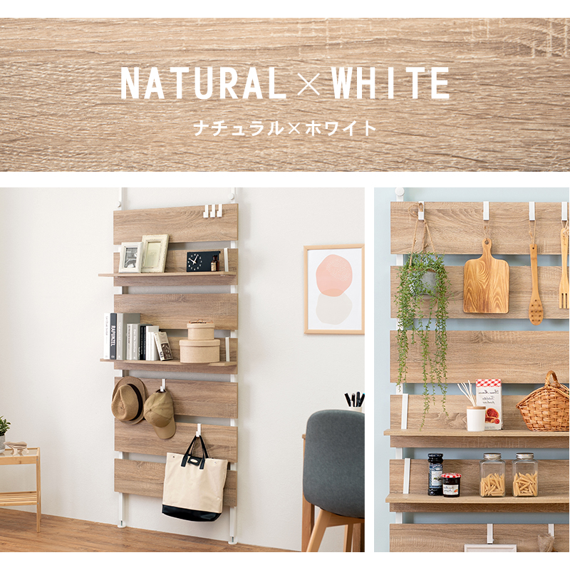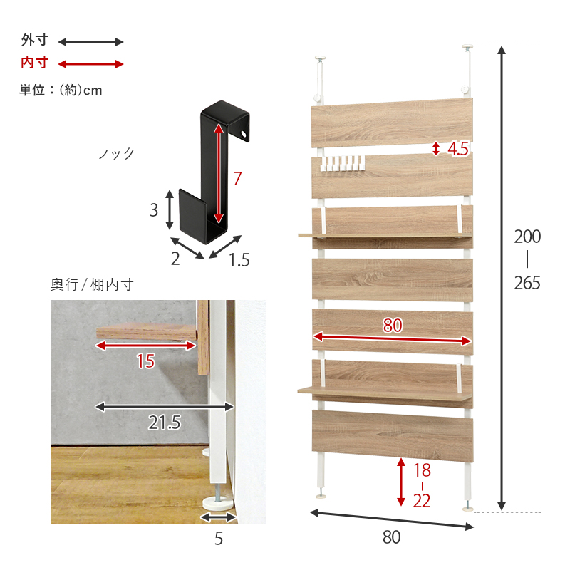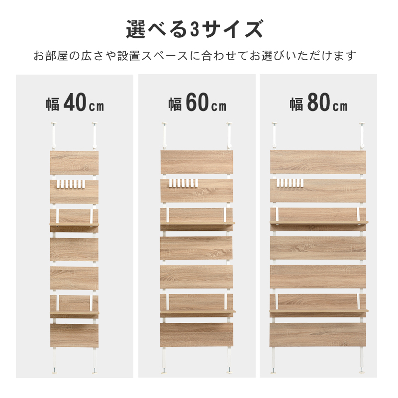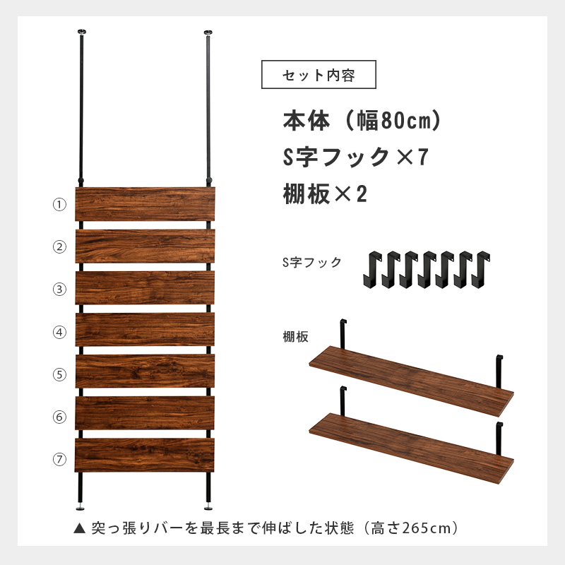 お部屋のいろいろな場所に設置できる突っ張り式ラック。パーテーションや間仕切りとしても活躍します。【サイズ】(約)幅80×奥行21.5×高さ200〜265cm【仕様】フレーム:金属(スチール)、棚板:プリント紙化粧繊維板棚板2枚■フック7ケ付組立品【送料】送料無料(但し、北海道・沖縄・離島にお届けの場合は別途お見積もりになります。)"}