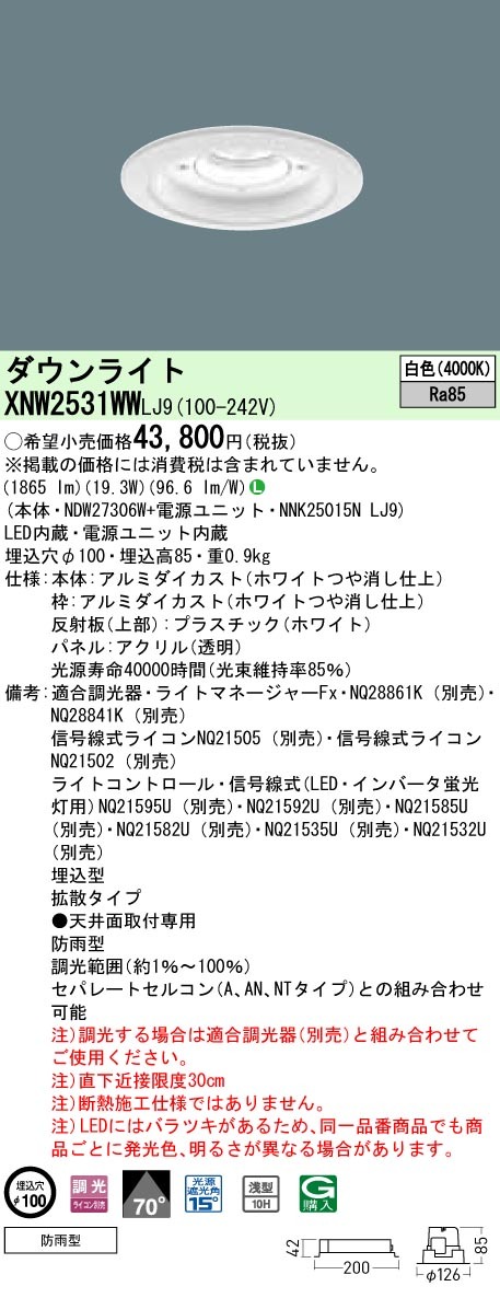 XNW2531WW LJ9 軒下用ダウンライトLED内蔵、電源ユニット内蔵【本体】NDW27306W【電源ユニット】NNK25015N LJ9光源◆LED(白色) ◆色温度:4000 K ◆光源寿命40000時間(光束維持率85%)寸法・質量◆埋込穴径:φ100 mm ◆埋込高:85 mm◆質量:0.9 kg仕様◆器具光束:1865 lm ◆電圧:100〜242 V ◆消費電力:19.3 W ◆消費効率:96.6 lm/W◆【本体】アルミダイカスト(ホワイトつや消し仕上)◆【枠】アルミダイカスト(ホワイトつや消し仕上)◆【反射板(上部)】プラスチック(ホワイト)◆【パネル】アクリル(透明)◆Ra85◆埋込型◆拡散タイプ 光源遮光角15度◆●天井面取付専用◆防雨型◆調光範囲(約1%〜100%)◆セパレートセルコン(A、AN、NTタイプ)との組み合わせ可能◆調光する場合は適合調光器(別売)と組み合わせてご使用ください。◆直下近接限度30cm◆断熱施工仕様ではありません。