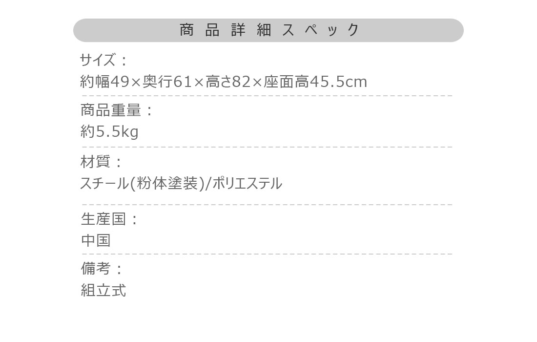 ●デザイン性の高い斬新なフォルムのチェア。●背面のクロスが特徴的でどの角度から見ても無駄のないシンプルなスタイルのアクロス。●あたたかみのある生地とインテリアになじみやすいカラーで様々なテイストに合わせることができます。●背中にフィットする背面。緩やかなカーブを描いているので、背中にフィットして座り心地をUP。●引き出しやすい背面の取っ手。背面のスチール部分は取っ手の役割も。チェアを引き出しやすくしてくれています。●脚先には保護キャップが付いているので、床を傷つける心配も少なく安心。●背面の脚部は、背面と繋がった斬新なフォルムをしており、唯一無二のデザインとなっています。商品サイズ:約幅49×奥行61×高さ82×座面高45.5cm商品重量:約5.5kg材質:スチール(粉体塗装)/ポリエステル生産国:中国備考:組立式"}