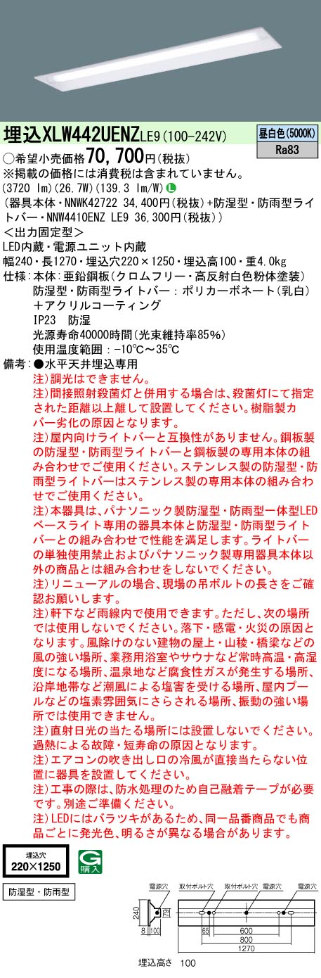 セット品番 XLW442UENZLE9セット内訳型番 NNW4410ENZLE9JANコード 4549980053119型番 NNWK42722JANコード 4549077657312パナソニック iDシリーズ4000 lmタイプ昼白色埋込穴幅 220 mm防湿型 防雨型