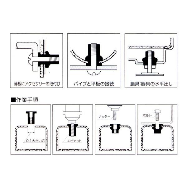 - タップ立ての難しい薄板やパイプ、角パイプ、溶接の出来ないプラスチック板にも片側から、ワンアクションで簡単に、しっかりとした♀ネジを作る事が出来ます。