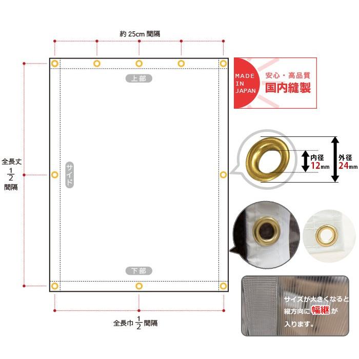 透明!ベタつきにくい。工場や倉庫、店舗に一般住宅まで幅広く活躍してくれるPVCアキレスセイデンクリスタルラインビニールカーテン帯電防止と防炎機能付きで厚みが薄く、扱いやすいビニールカーテンです【FT34】帯電防止・防炎 PVC アキレスセイデンクリスタルライン(0.3mm厚) ■カーテンサイズ:1cm単位のオーダー■厚み:0.3mm■重量:約400(g/m2)■機能:防炎・帯電防止(べたつき軽減)■ハトメサイズ:外径24mm 内径12mm(カーテンのサイズにより変わる場合があります)■カラー:透明■摘要:日本製■ハトメ:上部約25cm間隔/サイド・下部は真ん中に1ヶ所真鍮/ゴールド(サイズによりカラーが異なる場合があります)※サイズによりハトメの間隔は異なります。指定可能■仕様:・四方折り返し縫製(補強白テープ入れ)・ハトメ数、ピッチはオーダー可能(別料金になる場合あり)・サイド・下部ハトメ入れ可能(500ピッチ前後) ・ご希望の特殊仕様での仕上げ可能(別料金)■注意事項・オーダー商品のため、キャンセル・返品・交換は対応できません・色、質感等は、無料サンプルで事前にお確かめください
