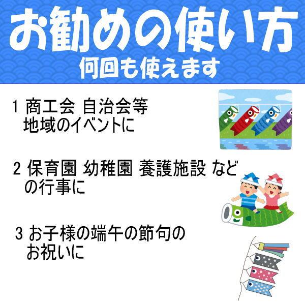 在庫処分のための特別価格です吹流しと鯉のみのセットですポール 矢車 ロープなどは付属しません口金具はオプション(別料金)ですセット販売のためバラ売りはできませんセットの組合せの中に生地や図柄が一部分の異なるものまた細かいシミなどががあるかもしれませんがいずれも掲揚(鯉のぼりを泳がせる)した際には正規品と同様にご使用いただけますほとんど問題はありません細かいことが気になるかたはご遠慮ください返品または交換は固くお断りいたします【長さ】 5m【素材】 ナイロン【口金具】 商品には付属しませんオプション(別料金)です菱型金具(丈夫 お勧め)とバネ式の2種類があります"}