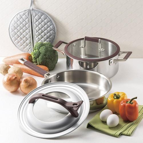 ●材質:鍋・フライパン:(本体)18-8ステンレス鋼・アルミニウム合金・16-0ステンレス鋼、(取手)ステンレス・シリコン、(つまみ)ステンレス鋼・シリコン、(蓋)全面物理強化ガラス、フライパンカバー:(本体)アルミ合金(シリコン樹脂塗装加工)・(取手)フェノール樹脂・全面物理強化ガラス、ミトン鍋敷き:(表面)綿(特殊耐熱樹脂加工)、(中材)ポリエステル・ナイロン・不織布(ポロプロピレン)、(裏面)綿(シリコン樹脂加工)