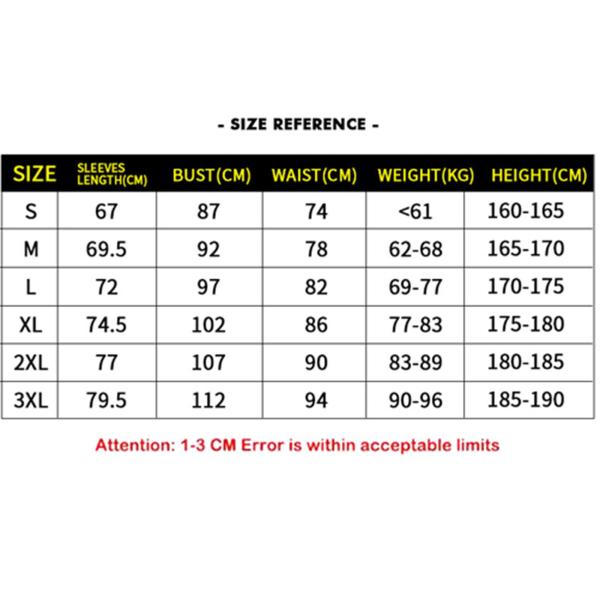 3XL:袖丈:79.5cm / 31.30inch.バスト:112cm / 44.09inch.ウエスト:94cm / 37.01inch.重量:90-96kg.身長:185-190cm