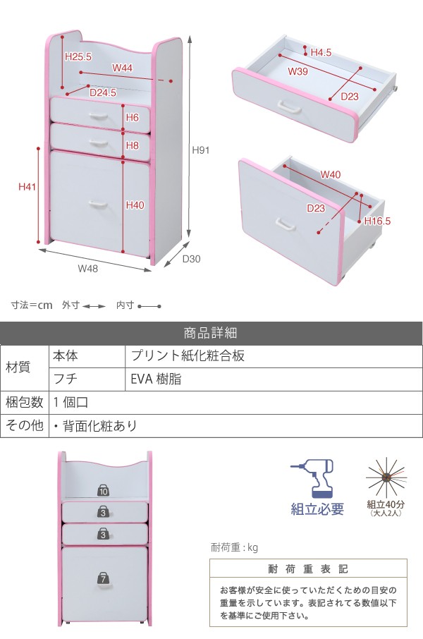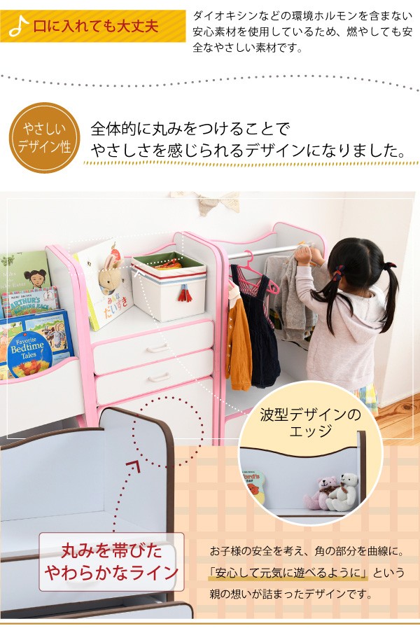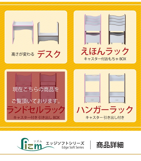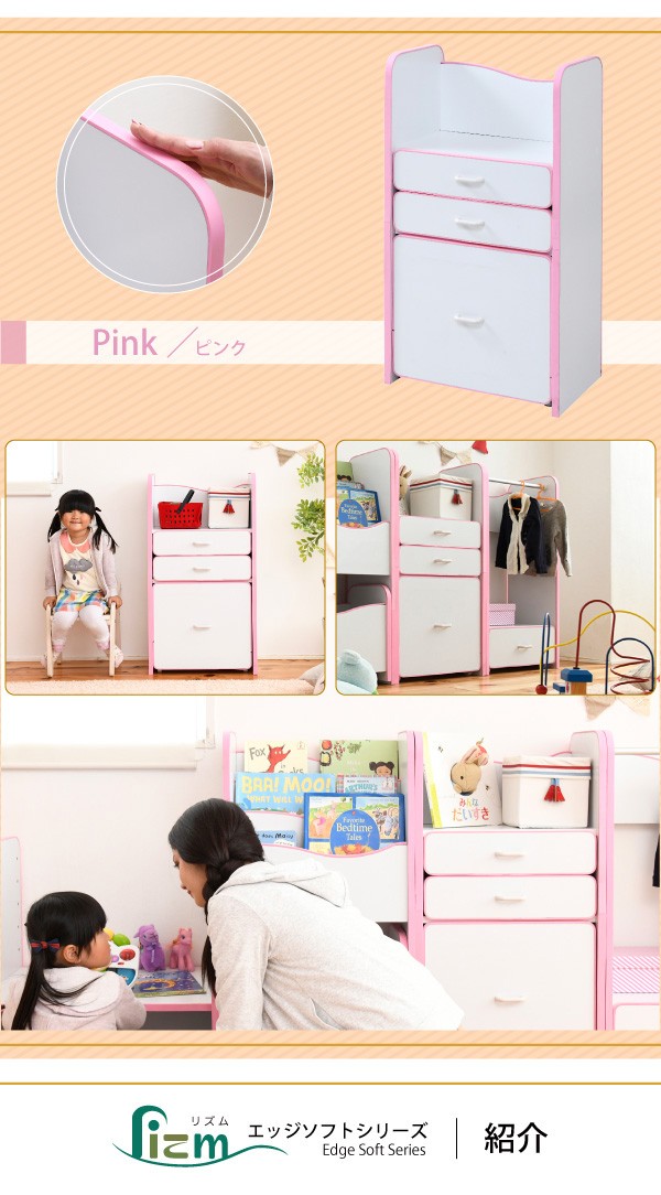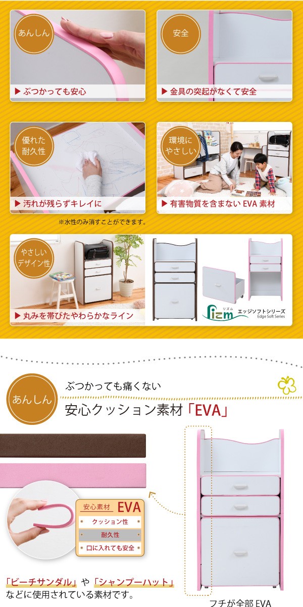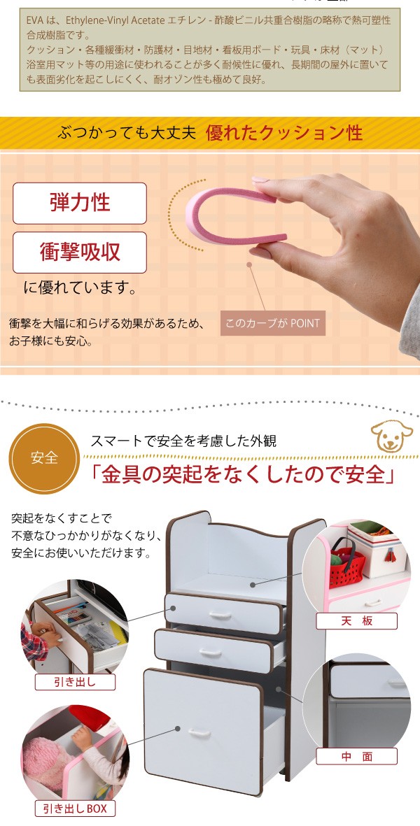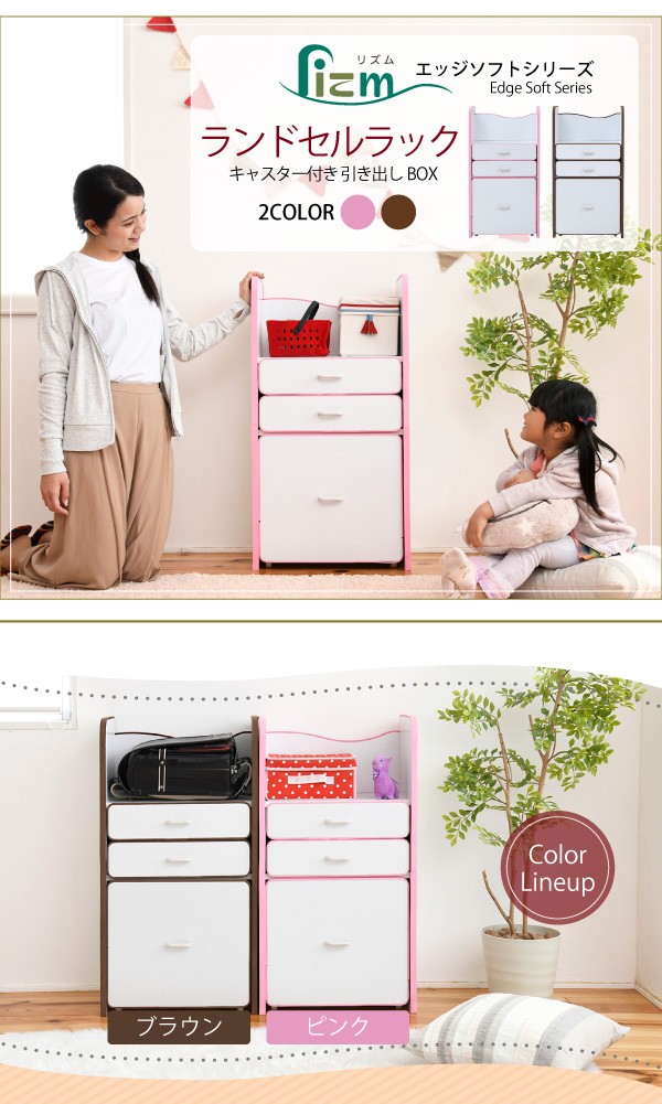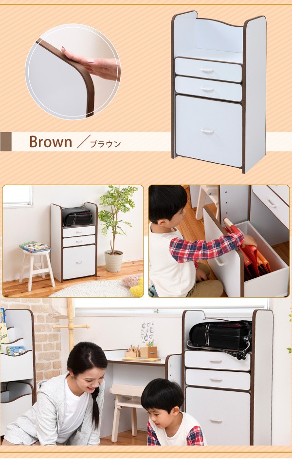 弾力性、衝撃吸収に優れたEVA樹脂をすべてのフチに採用。さらに角を丸くして金具の使用を極力減らした、小さなお子様も安全にご使用いただけるシリーズです。ランドセルを置くのに最適なスペースの天板や大きさの異なる引き出しなど多様な収納部が、お子様の整理整頓の力をアシスト。自分で考えてお片付けをする習慣が身に付きます。大きい引き出しはキャスター付きなのでお子様の力でも楽々引き出せます。*本体サイズ:[外寸]幅48×奥行30×高さ16.5(有効40)cm*材質:[本体]プリント紙化粧合板 [フチ]EVA樹脂*耐荷重:[引き出し小]約3kg以下[引き出し大]約7kg以下*備考:背面化粧あり*組立時間(目安)(大人2人):お客様組立(40分)*中国製■送料:全国一律900円(北海道は1200円) ※沖縄県・離島は別途送料がかかりますので、事前にお問い合わせ下さい。[FES-0003]おもちゃ収納 おもちゃラック トイボックス おもちゃBOX おもちゃ箱 収納ボックス 子供収納 子供部屋 FES-0003 PayPay残高払いこちらの商品は[エッジソフトシリーズlism ランドセルラック]になります。