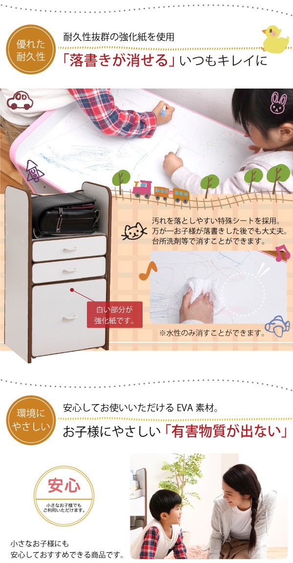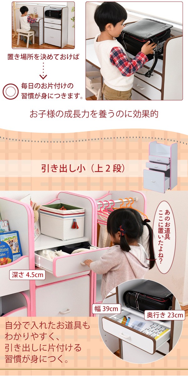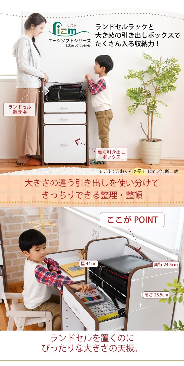 ランドセルを置くのに最適なスペースの天板や大きさの異なる引き出しなど多様な収納部が、お子様の整理整頓の力をアシスト。