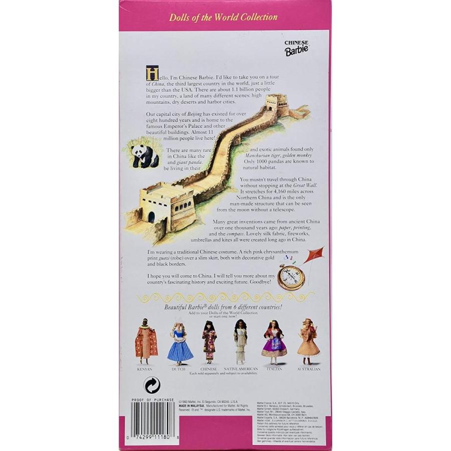 | 商品説明 | Dolls of the world collectionChinese BarbieDressed in Chinese attireBarbie takes you on a Chinese tour with a story on the back of the boxComes with a brush and stand |