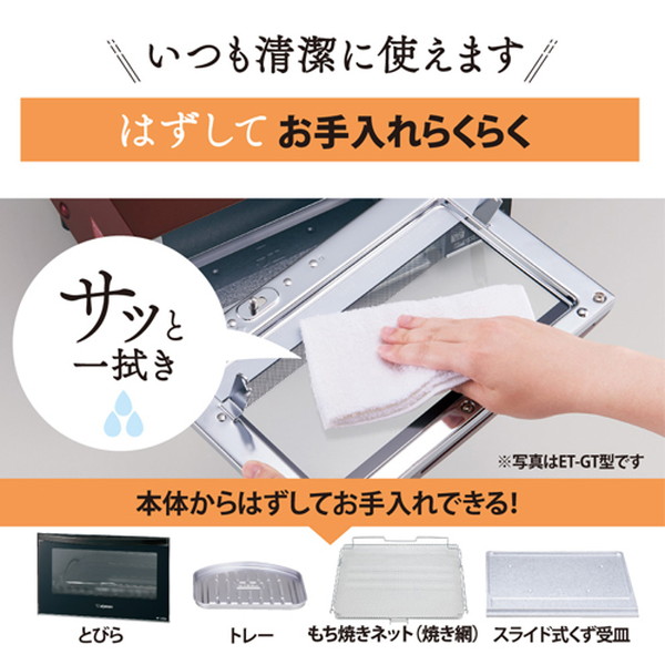 ●メーカー…象印マホービン●型番…ET-GU30●庫内サイズ(W×D×H)mm…270×295×90●消費電力…1300W●タイマー…30分●重量…約5kg●サイズ…395(W)×345(D)×225(H)mm●温度調整範囲…80〜250℃●トレー内寸…255×255mm●コード長…1m●色…ボルドー●「トースト4枚が同時に焼ける」「25cmのピザが丸ごと焼ける」「ビッグ&ワイド庫内」 ●メニューに合わせて調節できる 「80℃〜高温250℃ 温度調節」 ●上手にこんがり「もち焼きネット(焼き網)」 ●料理のバリエーションが広がる「30分ロングタイマー」●ムラを抑えて焼ける「トースト3〜4枚専用スイッチ搭載」●ハイパワー「1300W」ムラを抑えて焼ける「5本ヒーター」(上2本・下3本)●お手入れ簡単!「はずせるとびら」●丸洗いOK! 「はずせるもち焼きネット(焼き網)」「スライド式くず受皿」原産国:中国